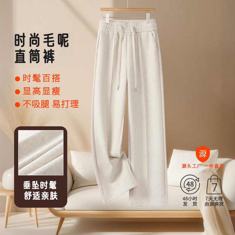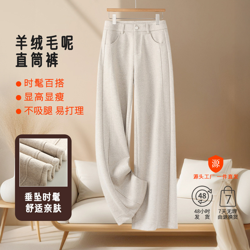 狭い版のウールのストレートのズボンの女性の2025新型の秋冬の高い腰の毛はベルベットのカジュアルでゆったりしている感じの広腿のズボンの子です。