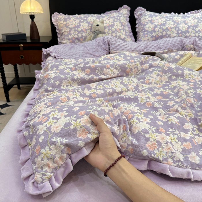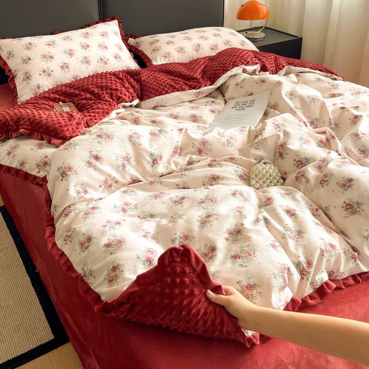 韩系秋冬款小清新云感棉加绒四件套花边款AB版豆豆绒加绒被套床单