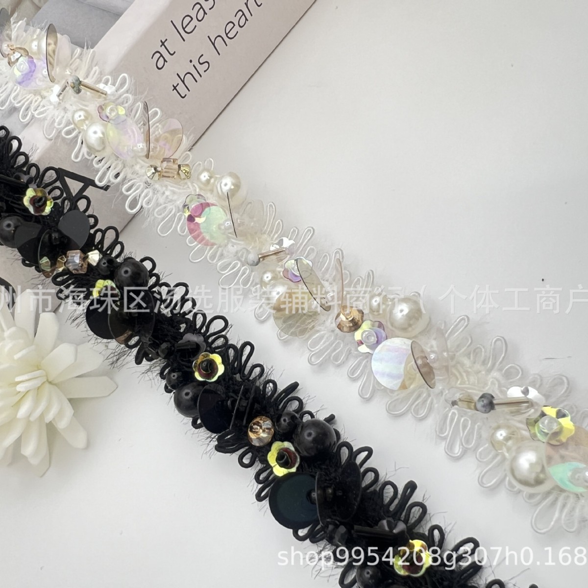 黑白蕾丝手工钉珠镶钻银珠花边亮片织带DIY服装门襟袖口装饰辅料