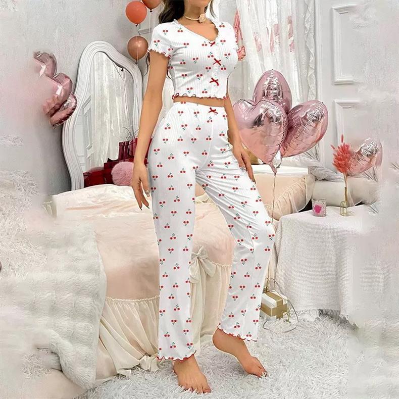 欧美跨境热销女士家居服樱桃印花长袖翻领睡衣可外穿长裤两件套装