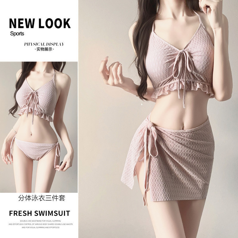 比基尼游泳衣女三件套抽绳遮肚显瘦保守爆款分体辣妹纯欲度假泳装