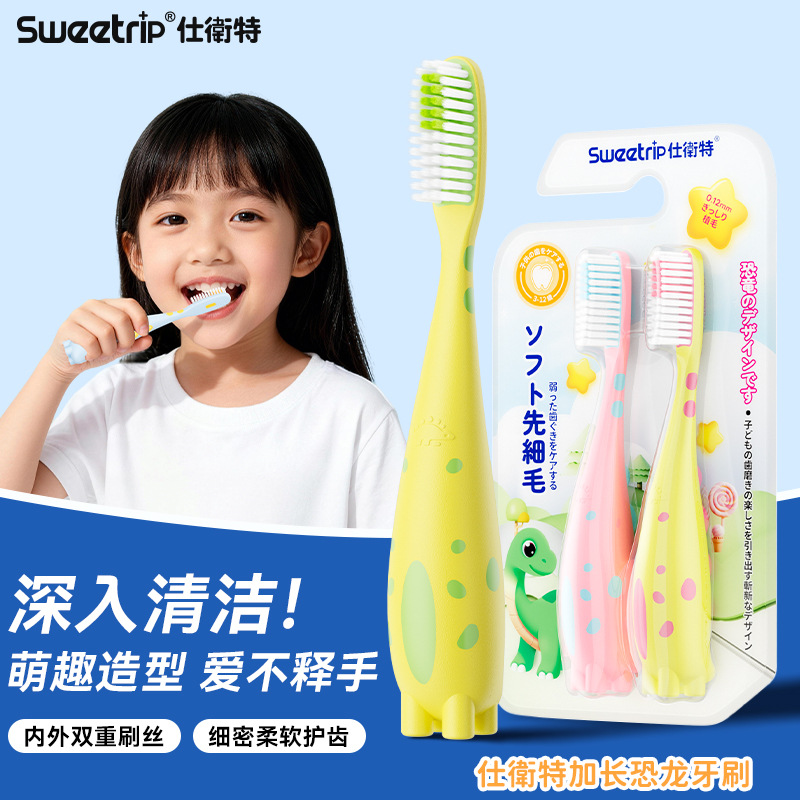 日本品牌儿童牙刷软毛萌趣卡通恐龙3-12岁清洁护龈小长头牙刷批发
