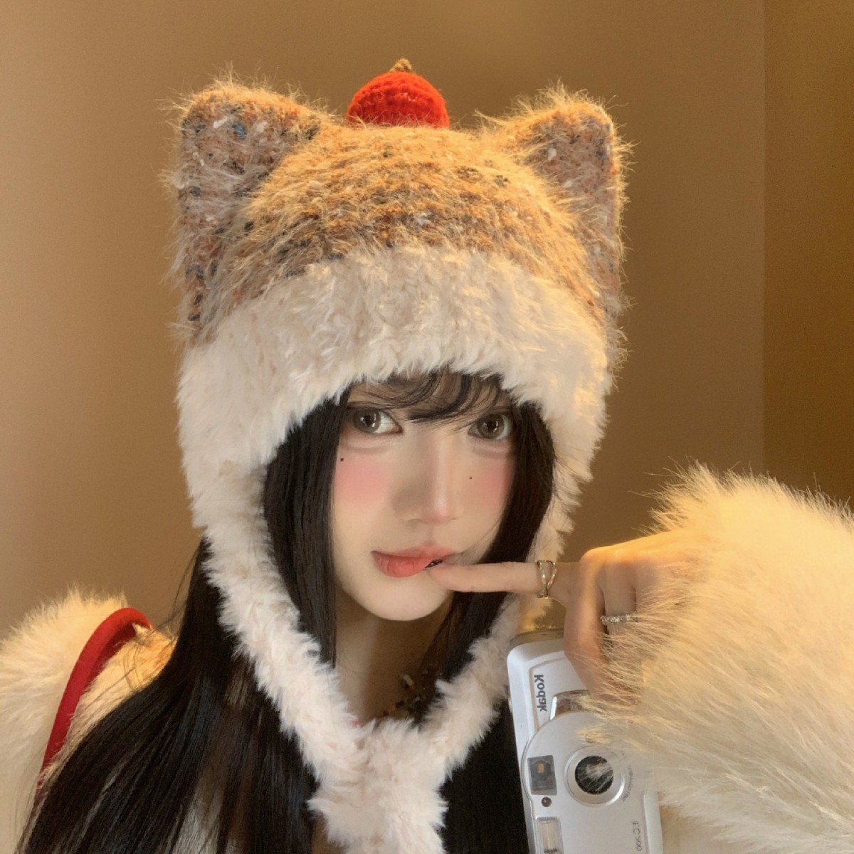 日系猫咪图案毛线帽子女生2025年新款秋冬季保暖加厚显脸小针织帽