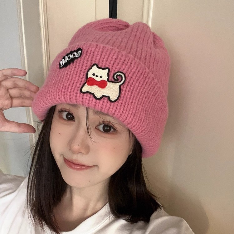可爱小猫刺绣针织帽子女秋冬保暖护耳包头帽显脸小防寒加厚毛线帽