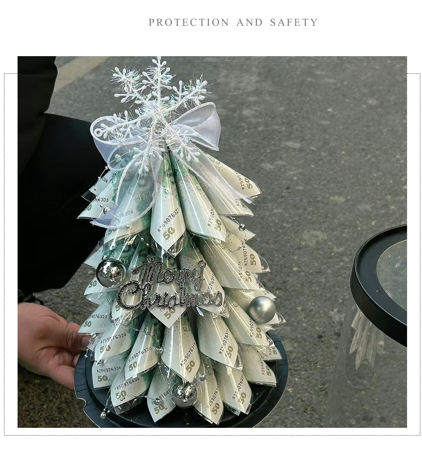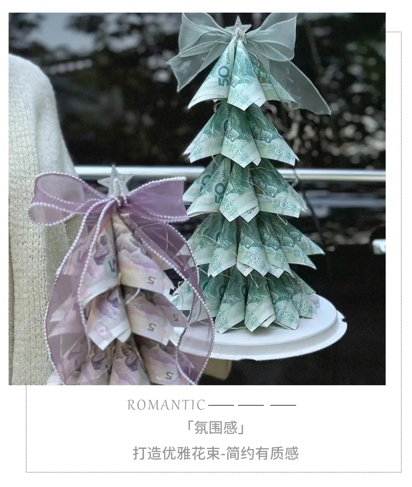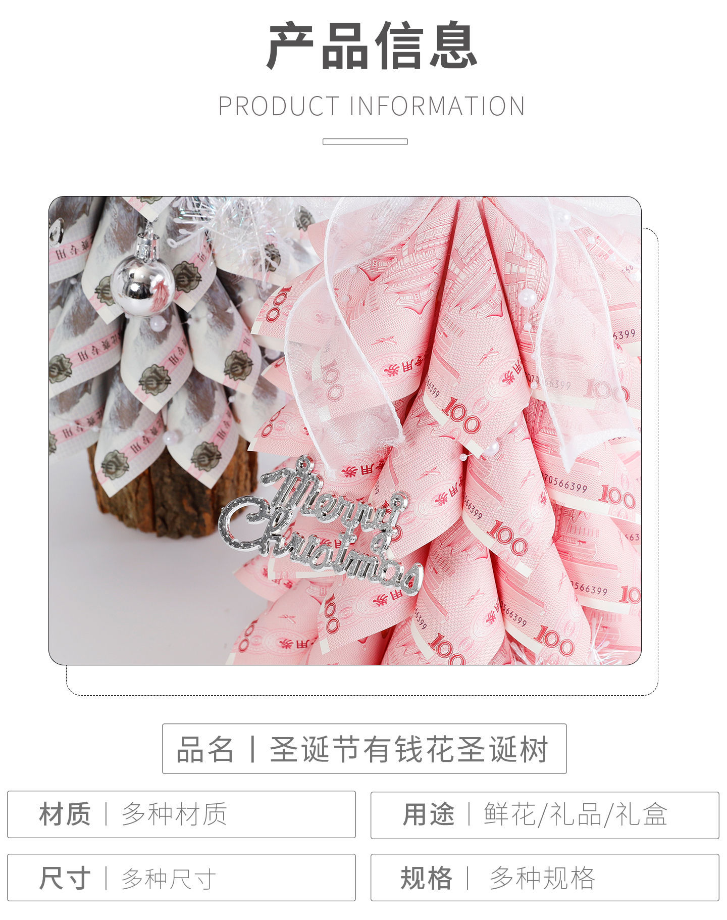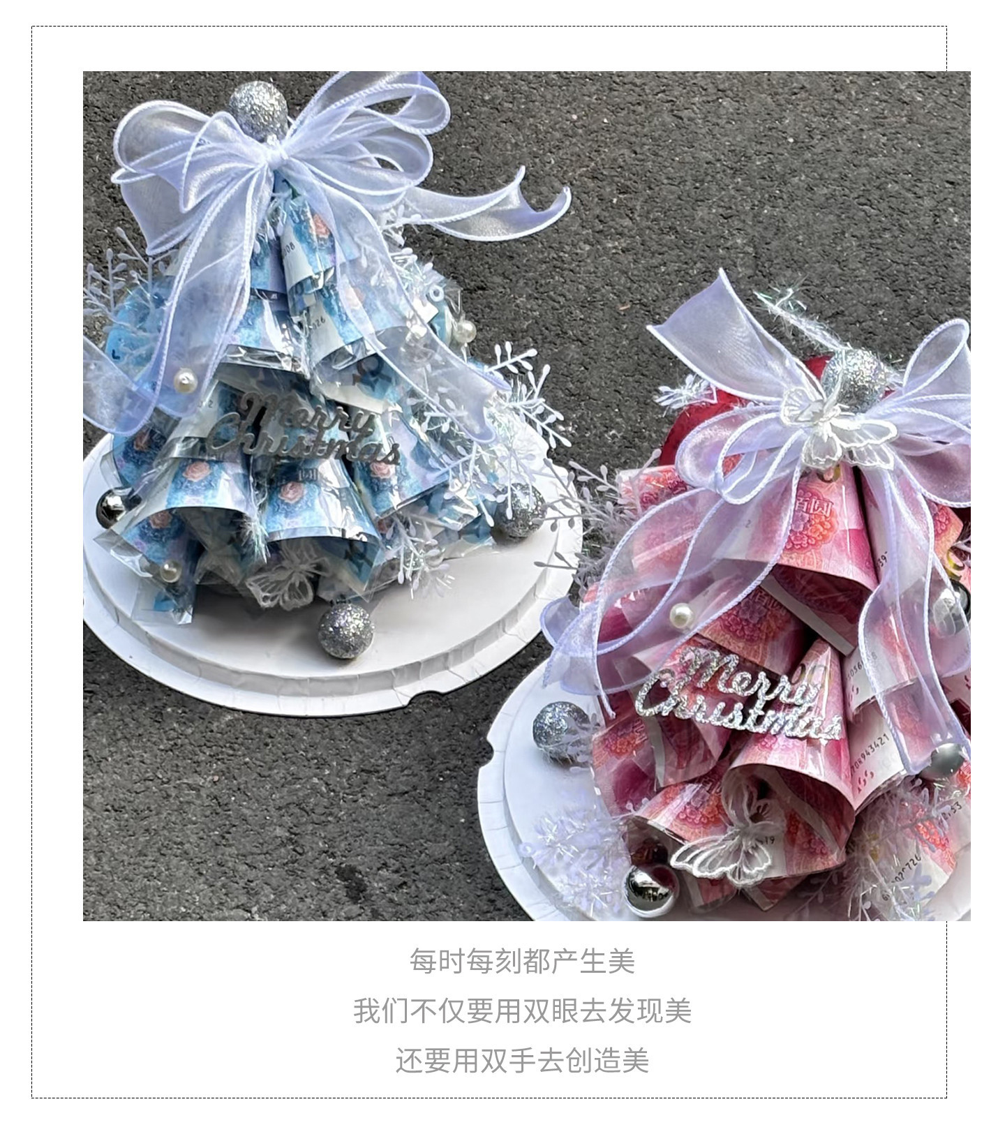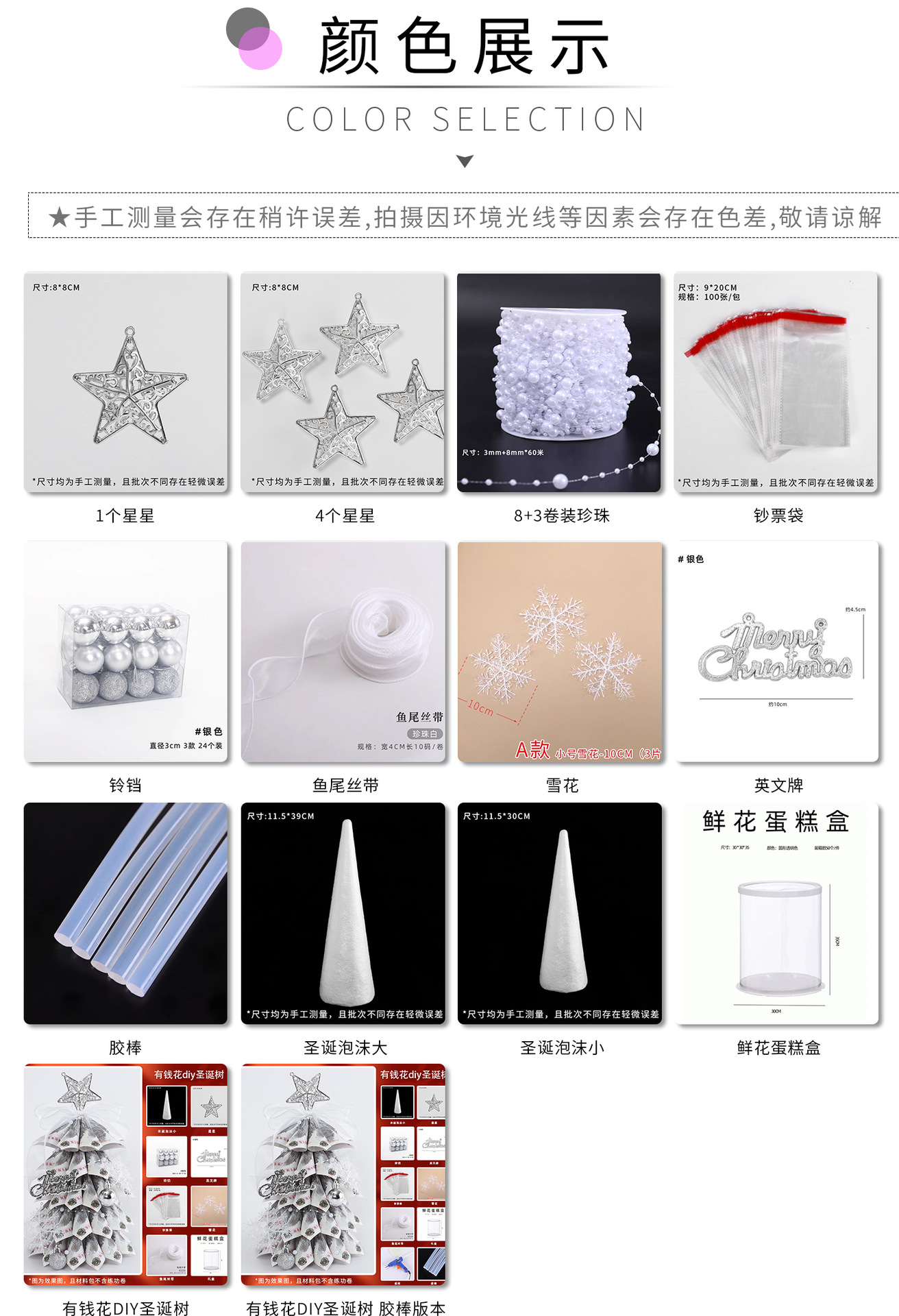 规格型号 有钱花圣诞树diy套餐-1;多规格,有钱花圣诞树diy套餐-2;多规格,银色星星4个;多规格,8+3卷装珍珠60米;多规格,【胶棒】长27cm5根;多规格,钞票透明袋200个;多规格,圣诞铃铛3cm24个装;多规格,圣诞树泡沫大号一个;多规格,圣诞树泡沫小号一个;多规格,透明圆形花盒一个35*30cm;多规格,雪花片一包3片;多规格,银色英文圣诞牌一个;多规格,鱼尾丝带【白色】4cm*10码;多规格