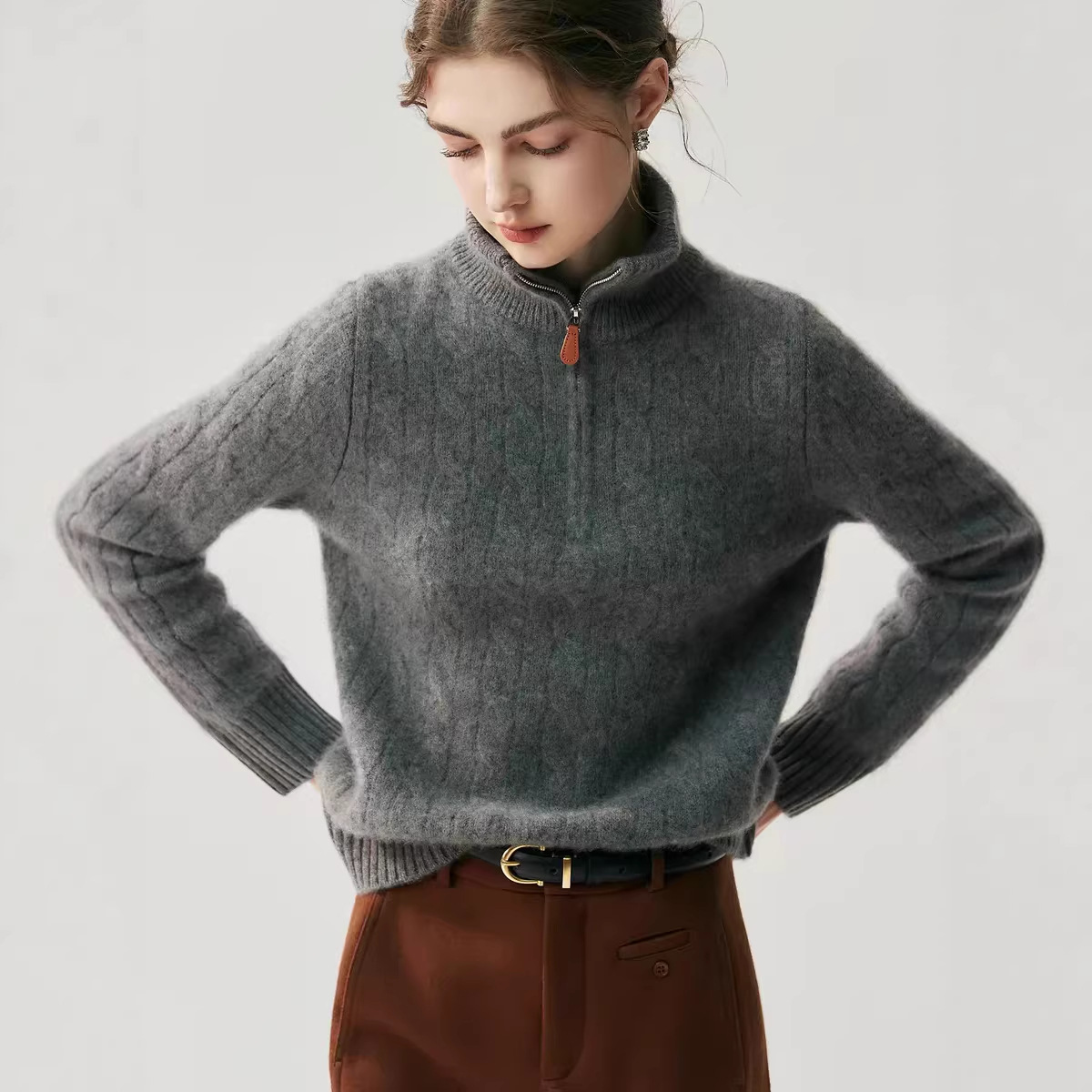 HE | 捞抡同款 老钱风加厚山羊绒衫女半拉链毛衣宽松羊毛针织衫