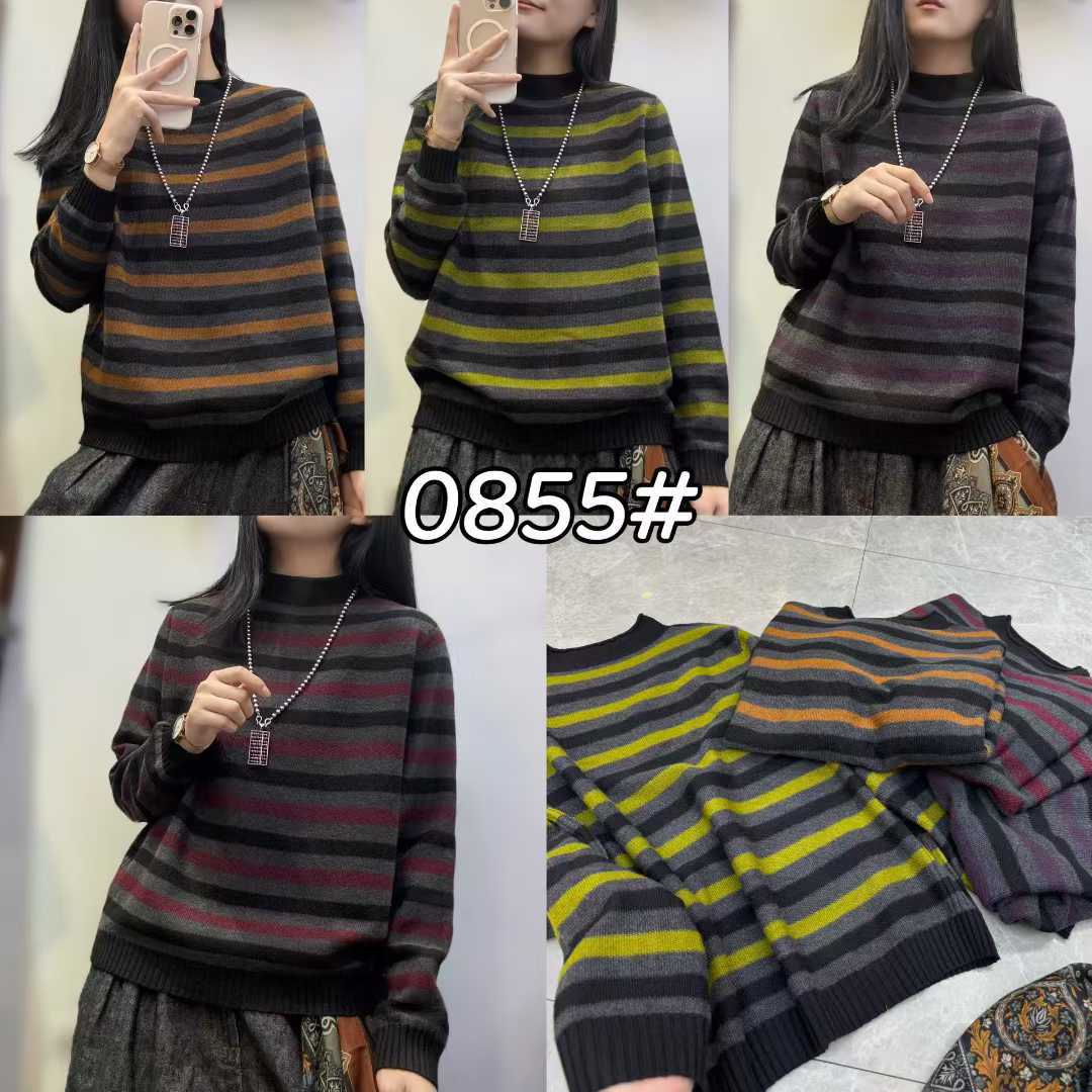 dm0855复古气质半高领条纹撞色宽松套头针织衫新品长袖针织毛衣潮