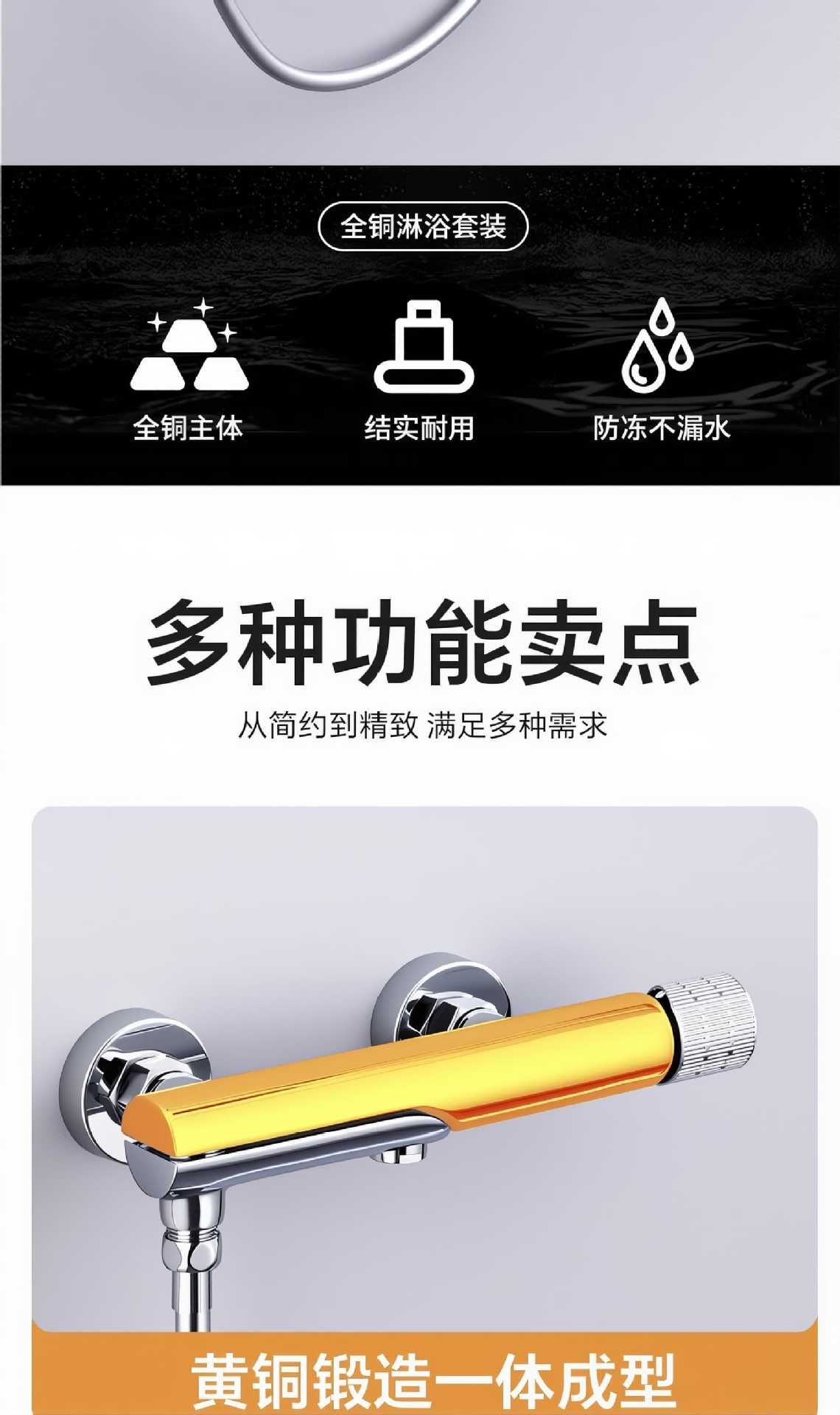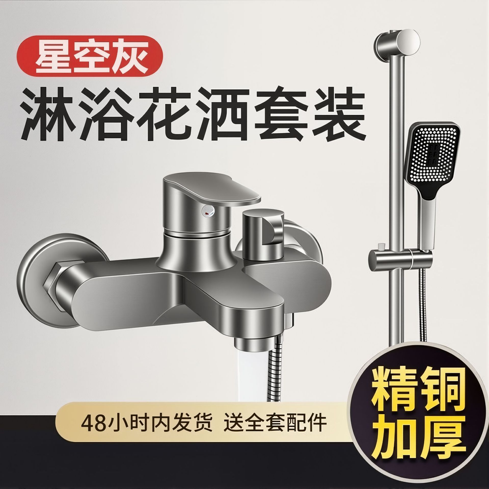 轻奢高颜值全铜水路枪灰花洒套装简易小户型瀑布增压两档淋浴套装