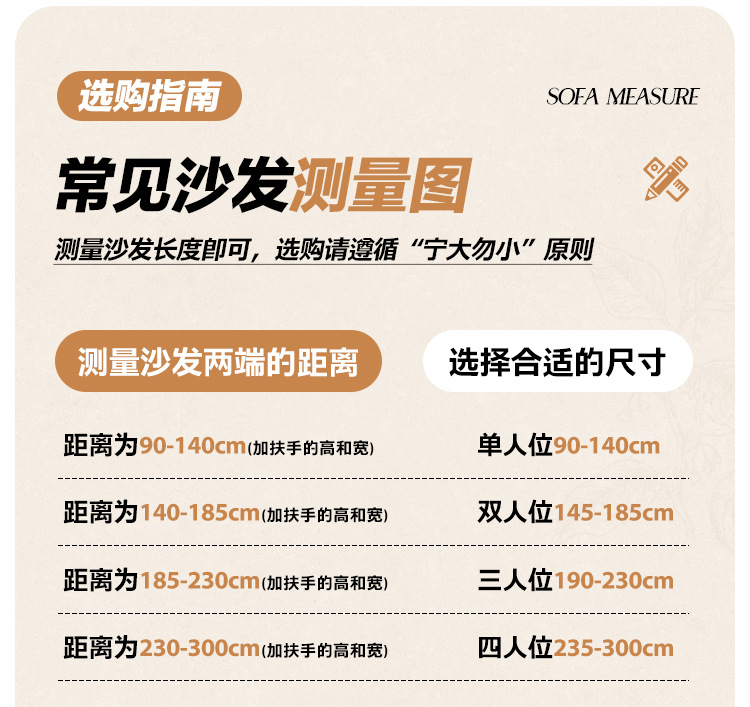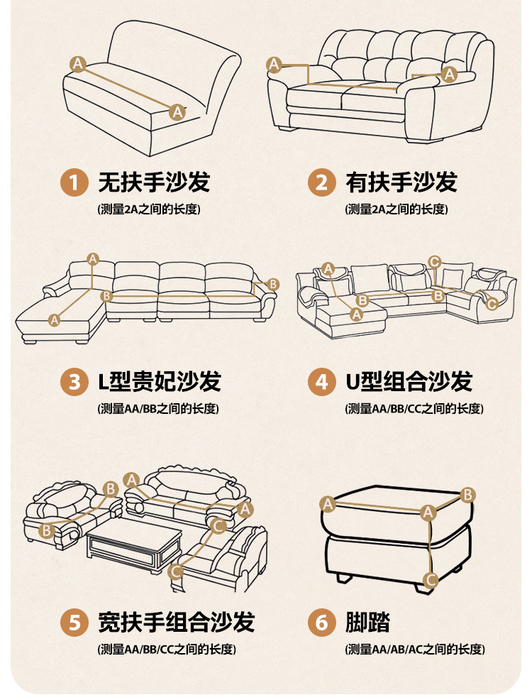 尺寸 S码【单人位适用90-140cm沙发】,M码【双人位适用145-185cm沙发】,L码【三人位适用190-230cm沙发】,XL码【四人位适用235-300cm沙发】,XXL码【五人位适用305-360cm沙发】,脚踏【适用范围70*90cm】,XXXL码【六人位适用365-430沙发cm】