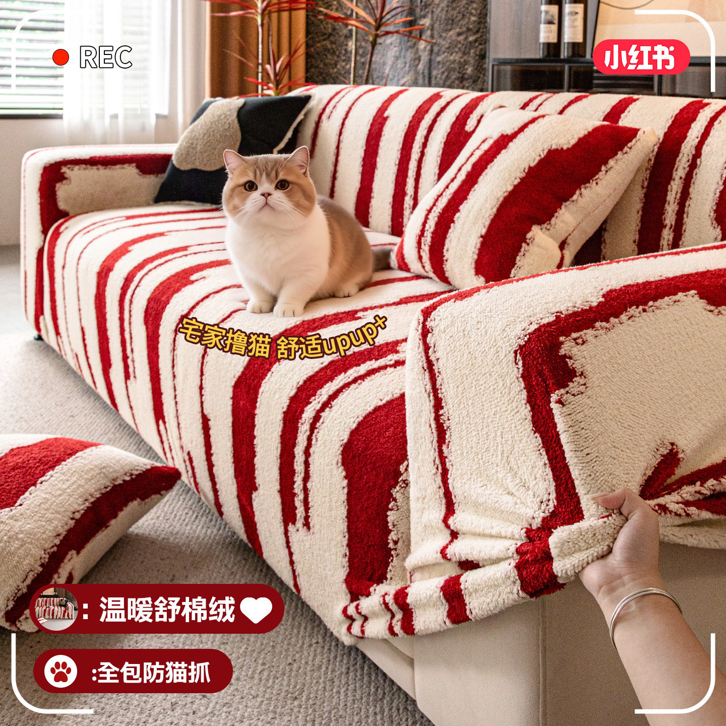 喜庆红色沙发套罩冬季舒棉绒沙发罩全包万能套2026新款防猫抓盖布
