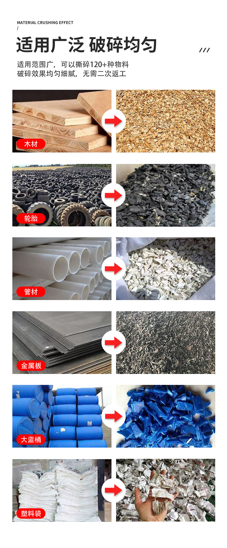 作用对象 PET塑料瓶,冷冻肉,废锂电池,矿泉水瓶/薄膜编织袋,废旧金属/金属屑/木材,废旧纸箱纸板,中药材,黄豆,玉米,花生,棉布、涤纶布、牛仔布、无纺布、牛津布、编织袋、吨包袋
