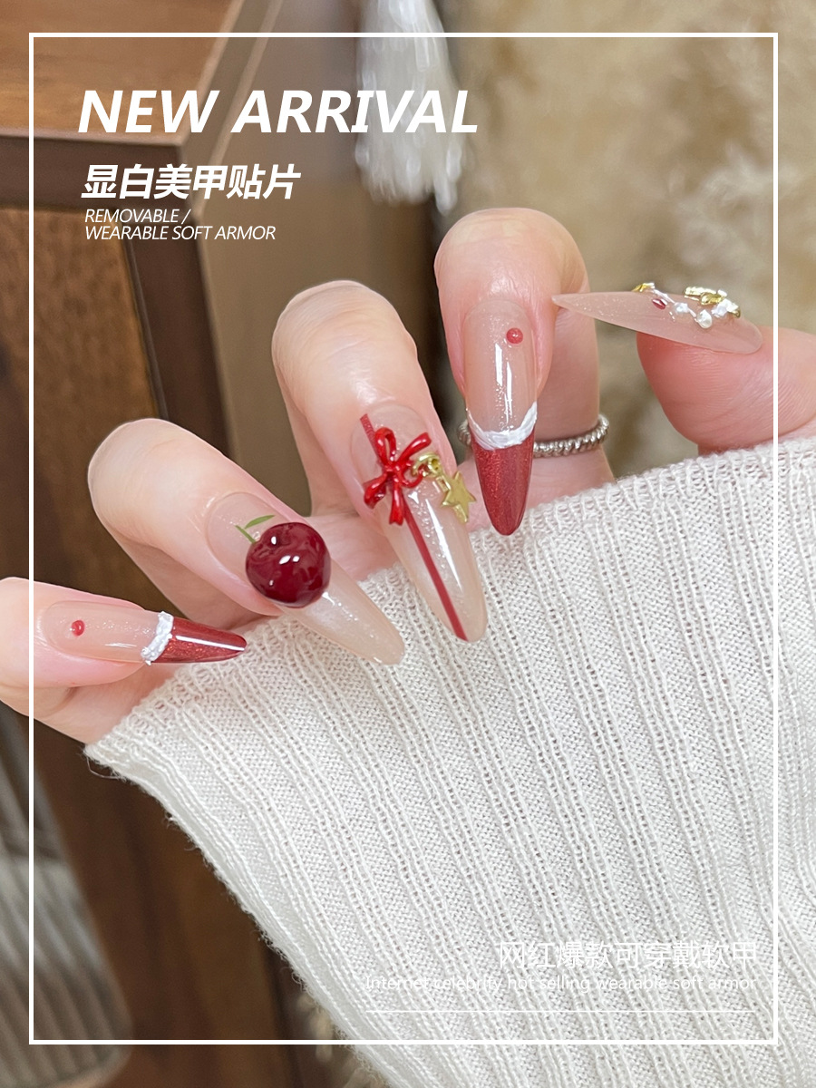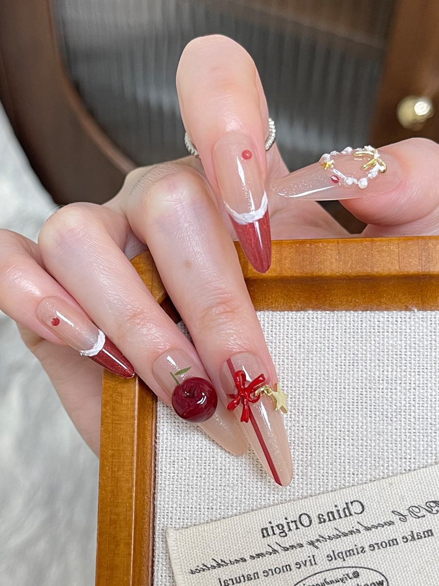 圣诞穿戴甲高级感甜酷风秋冬红色法式樱桃蝴蝶结花环手工美甲甲片