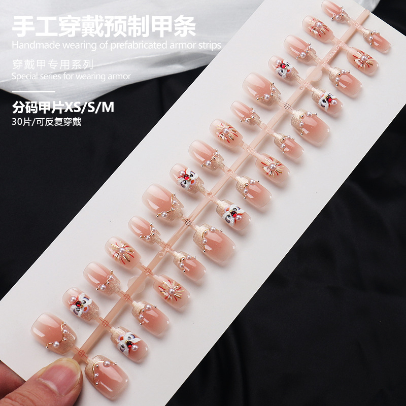 追光猫眼穿戴甲高级感裸粉珍珠烟花金箔醒狮短甲30片分码预制美甲