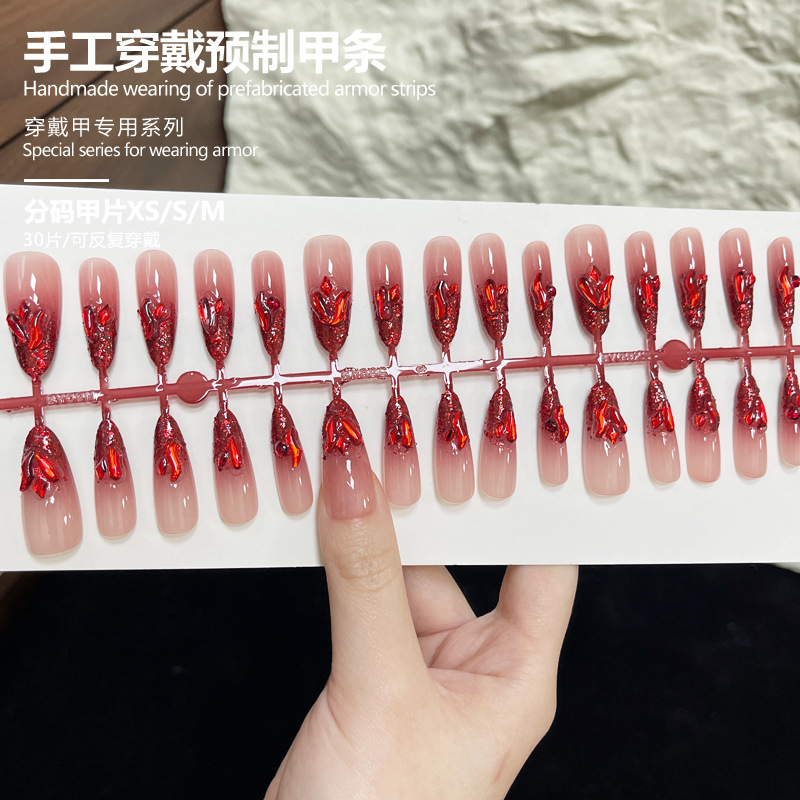 穿戴甲酒红车厘子暗红高级感水滴形立体红钻闪粉长款美甲甲片批发