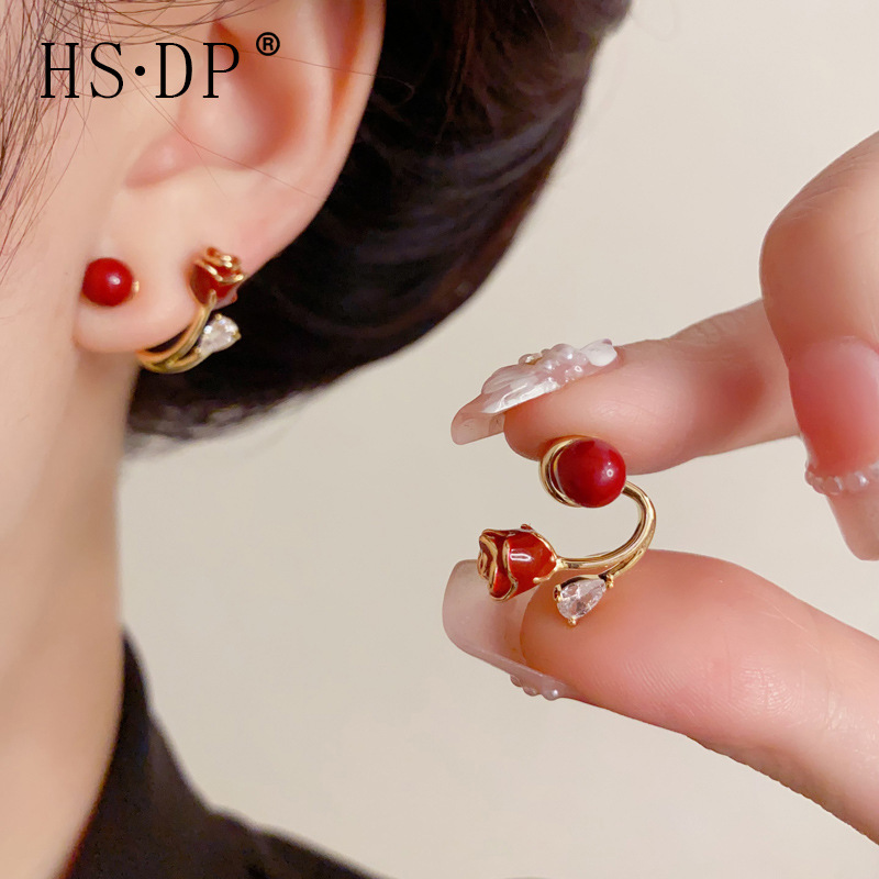 日韩时尚甜美百搭红色两戴玫瑰花耳钉小众气质简约设计感耳环批发