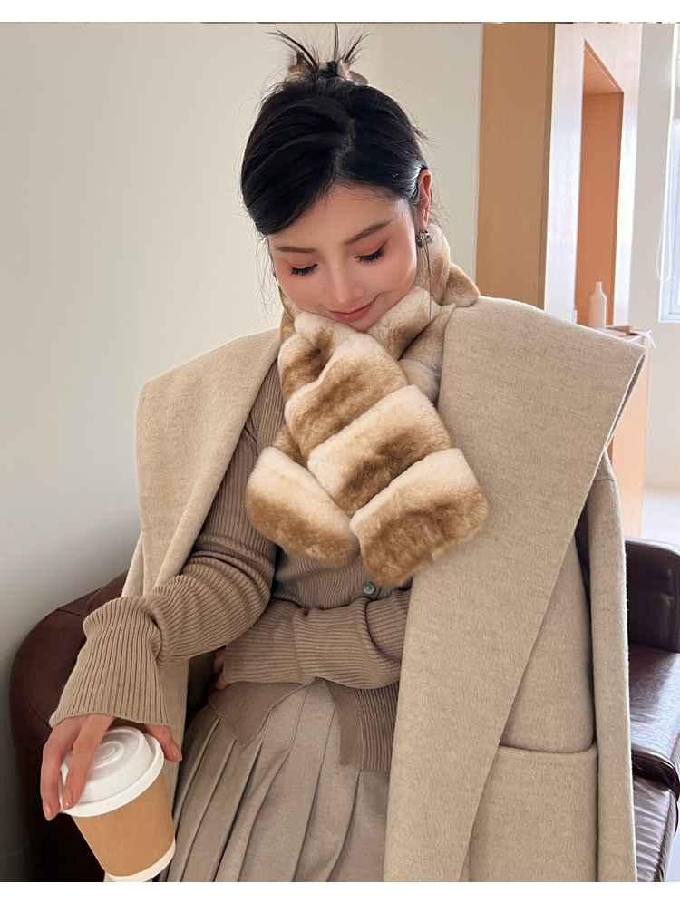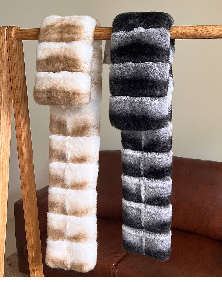 幅14cm、長さ90cm、両面ラクダウサギ毛皮とチンチラの青紫のストライプ柄の毛皮スカーフ