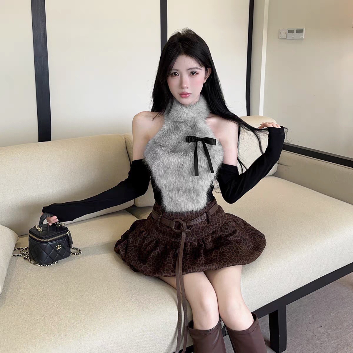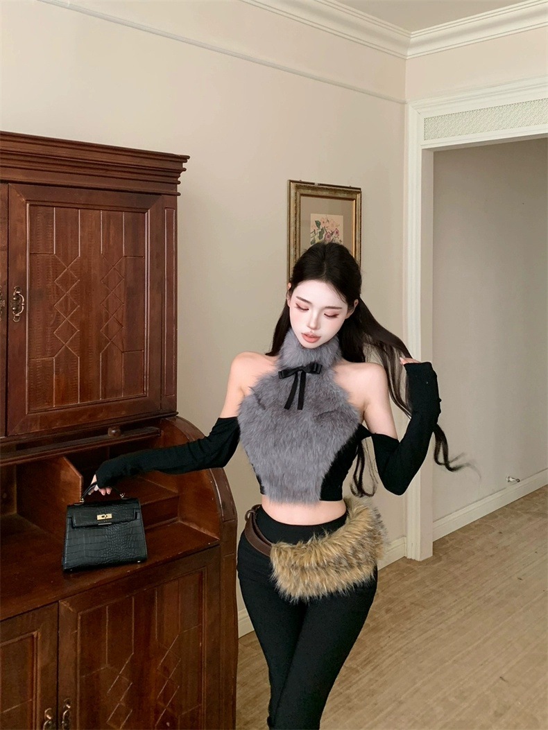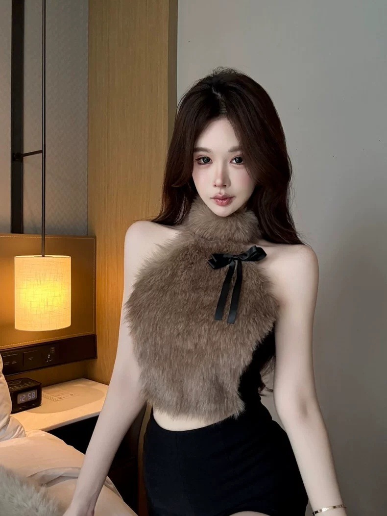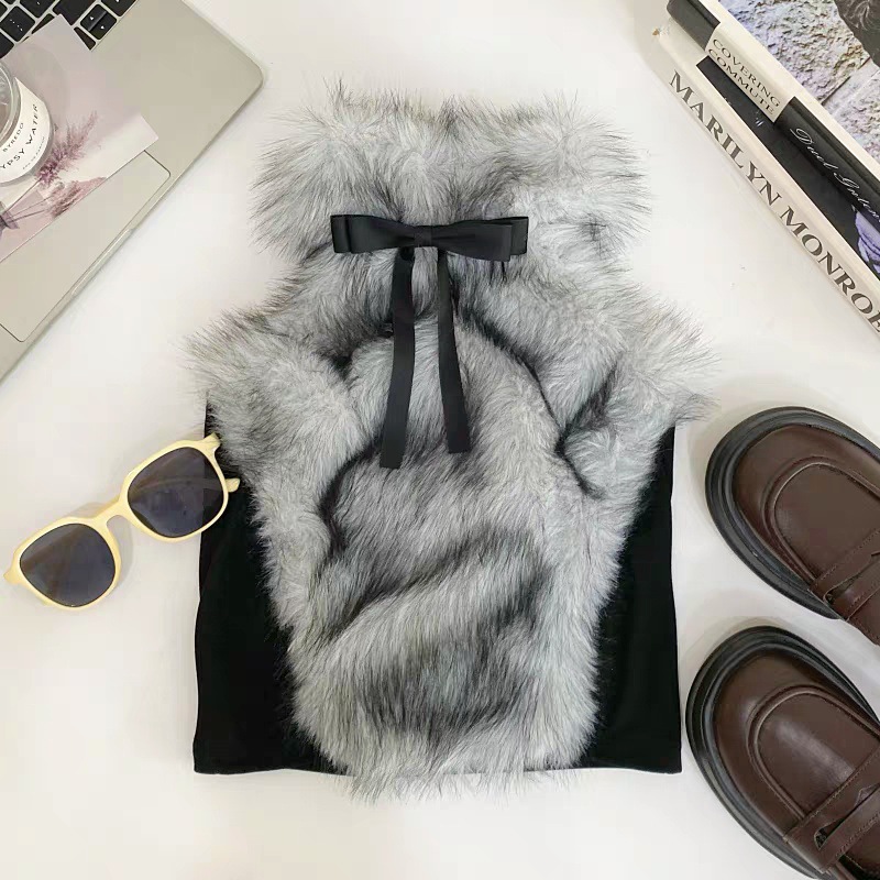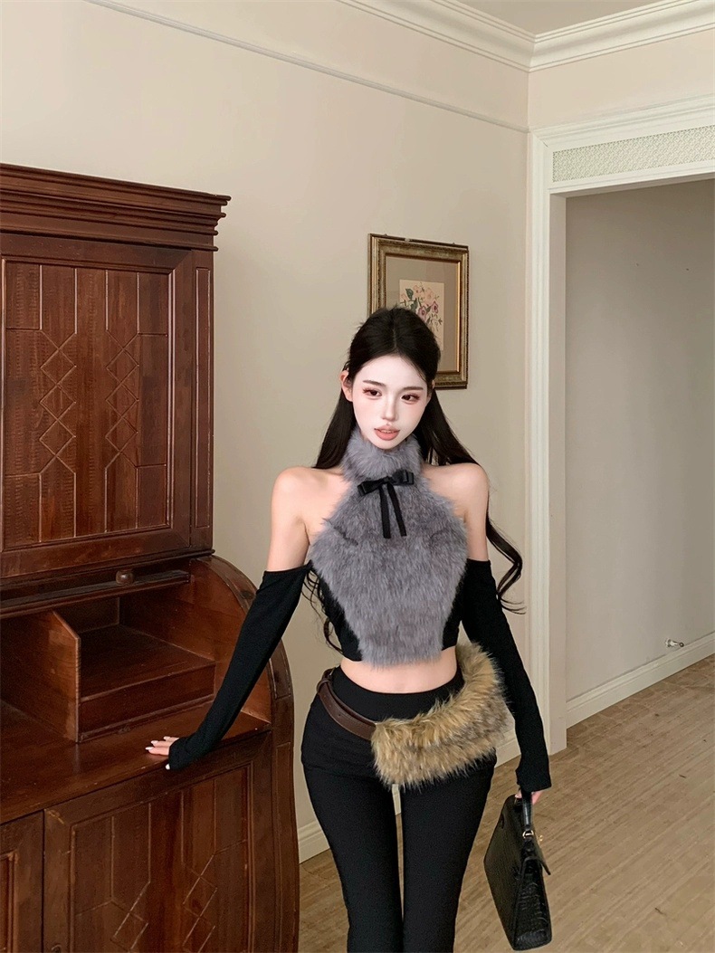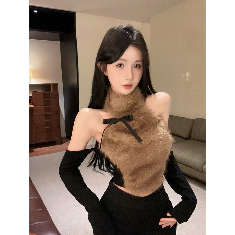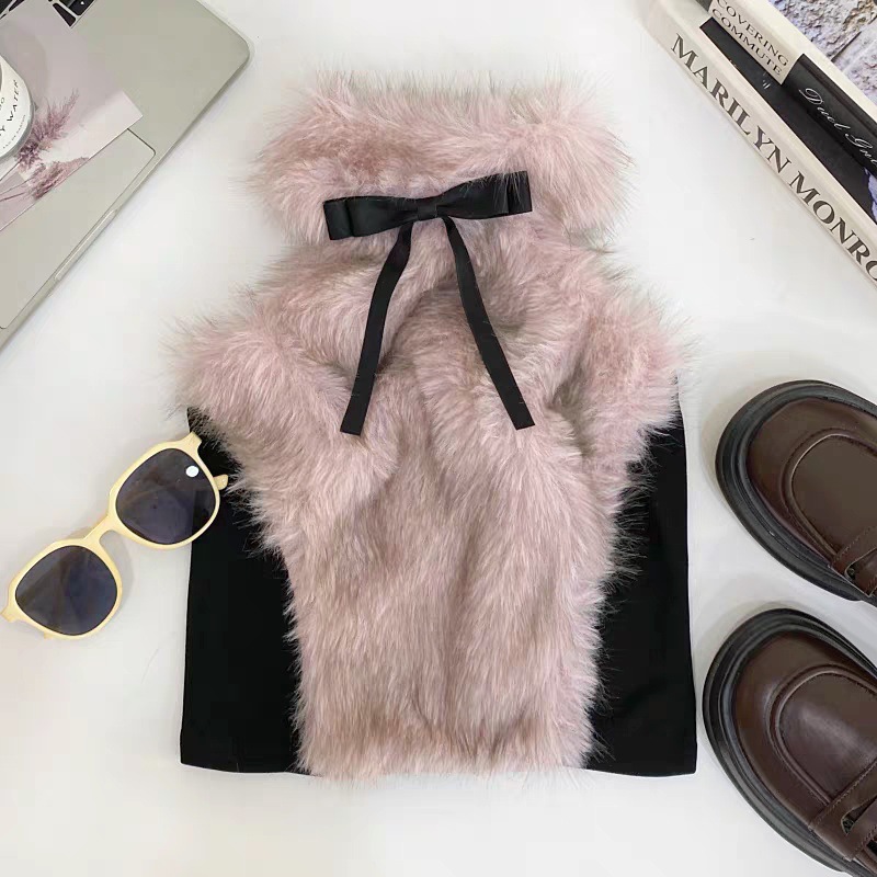秋冬季新款纯欲风辣妹气质毛毛拼接上衣短款蝴蝶结挂脖吊带背心女