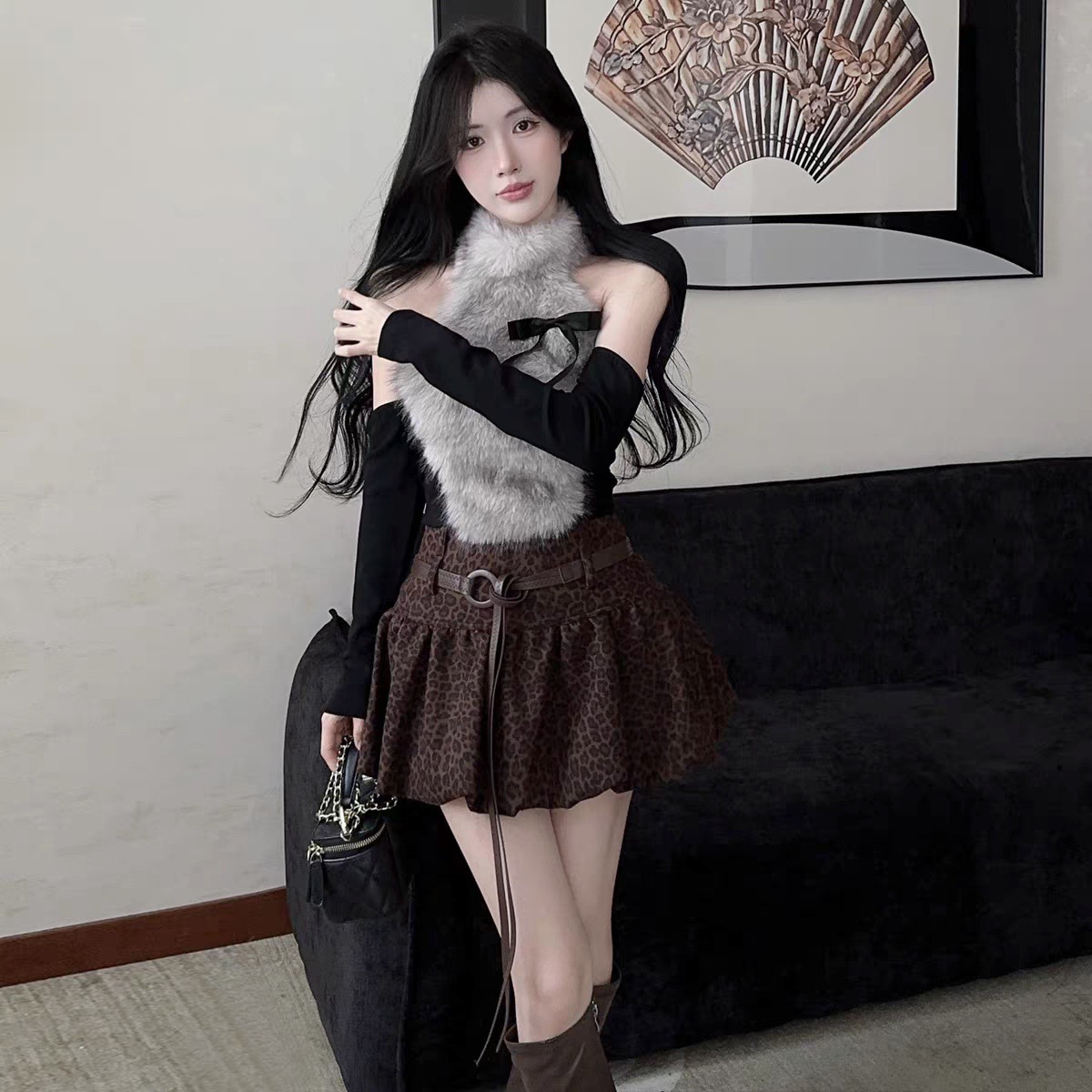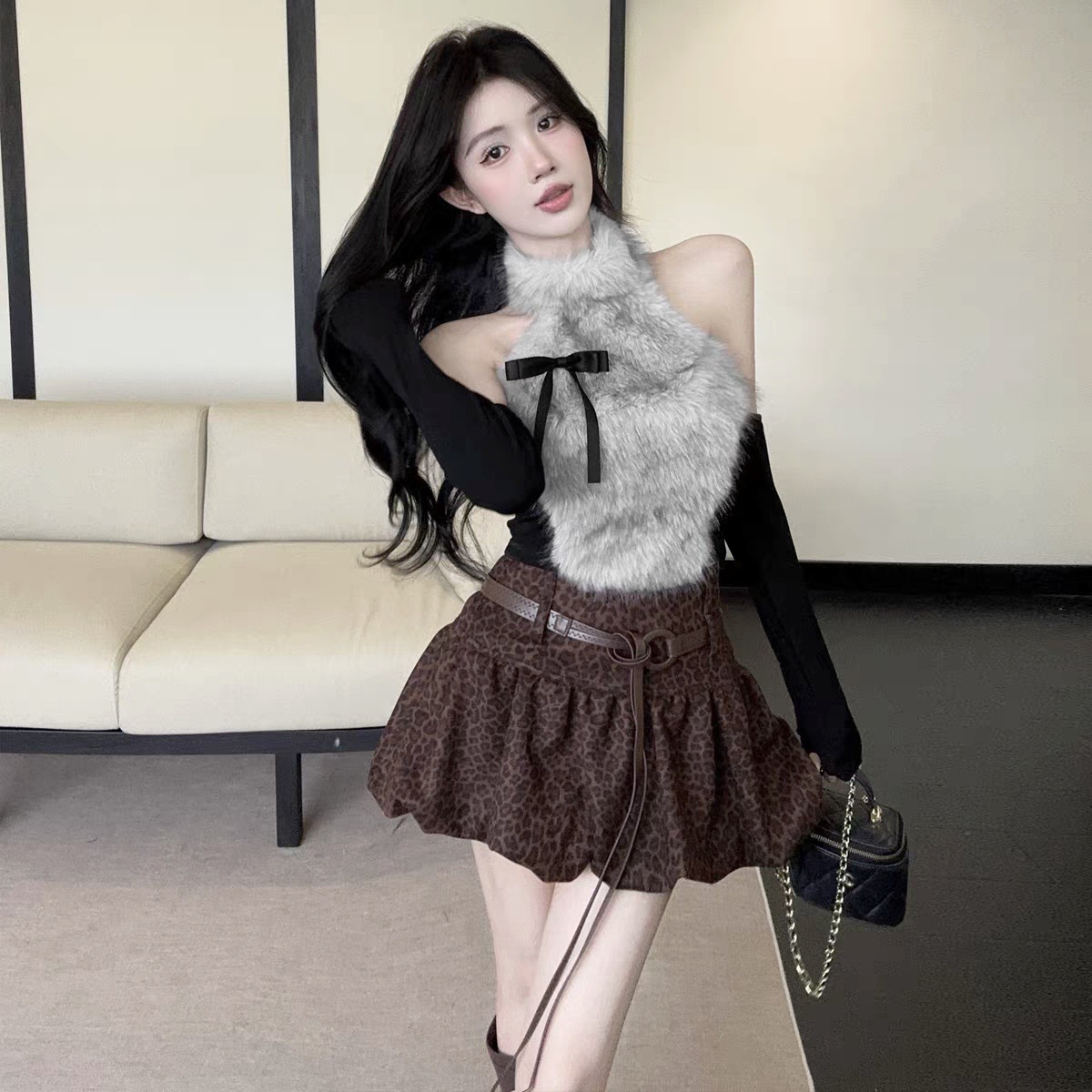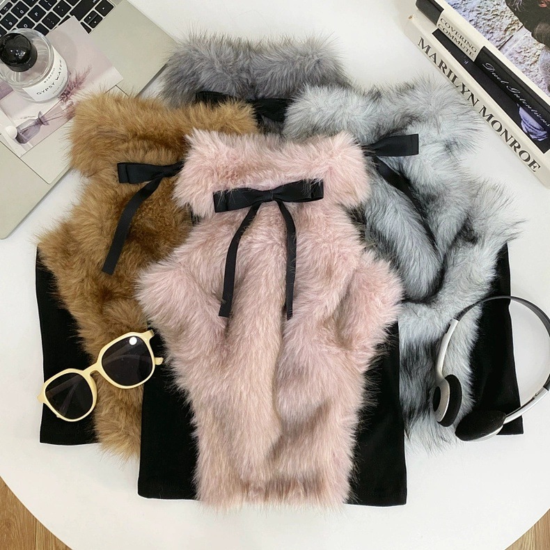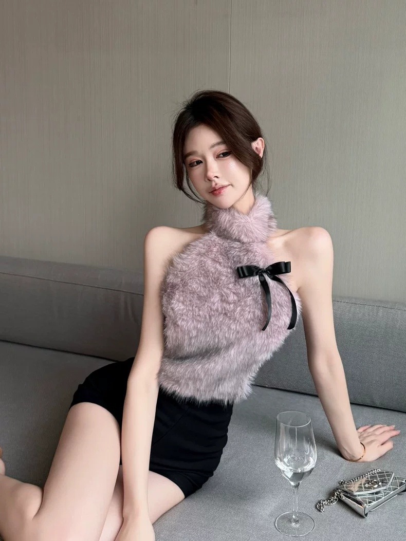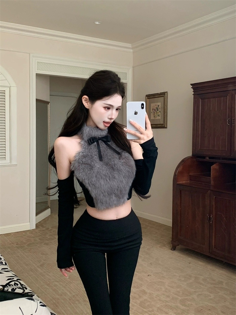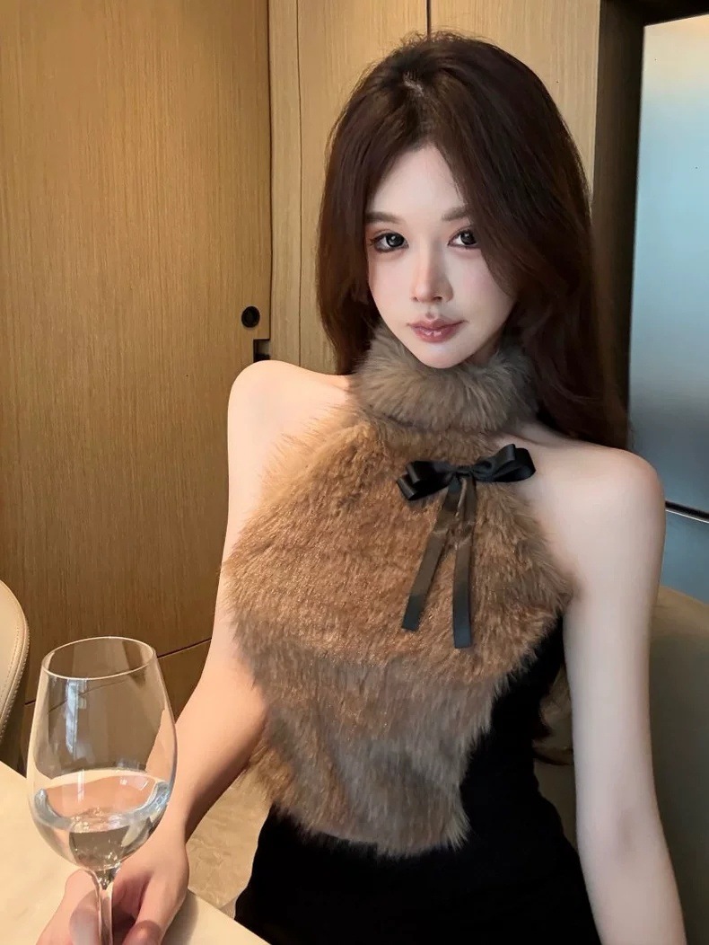 秋冬季新款纯欲风辣妹气质毛毛拼接上衣短款蝴蝶结挂脖吊带背心女