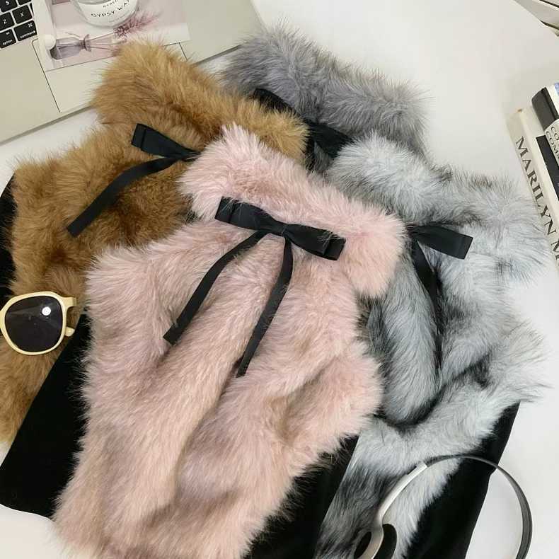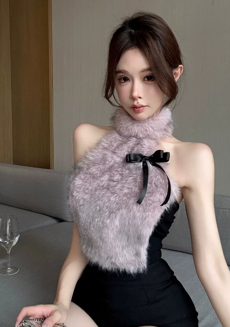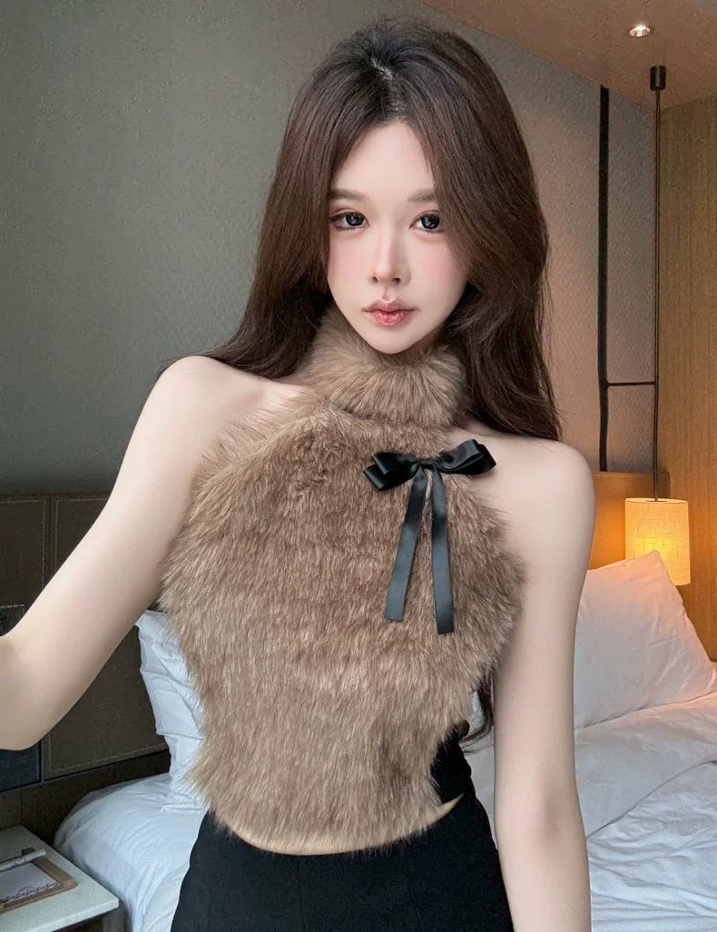 跨境爆款秋冬纯欲蝴蝶结毛毛挂脖保暖背心女外穿带胸垫白搭上衣