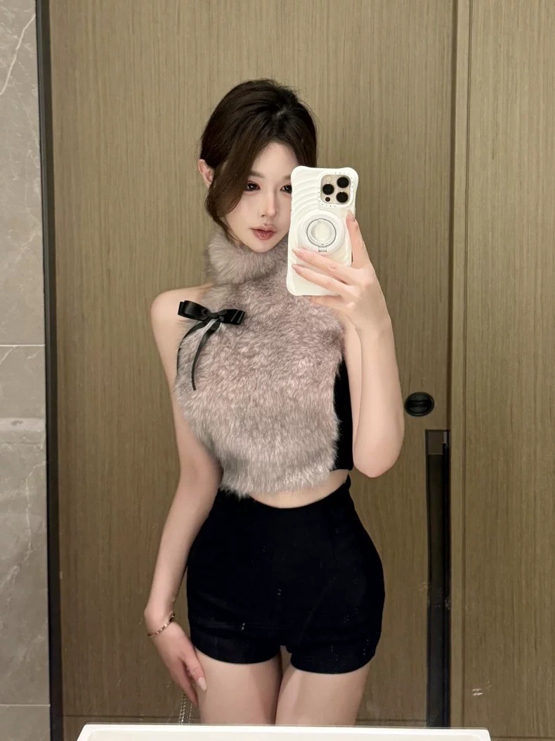 993#初秋新款纯欲毛毛挂脖保暖背心修身显瘦女固定带胸垫百搭上衣