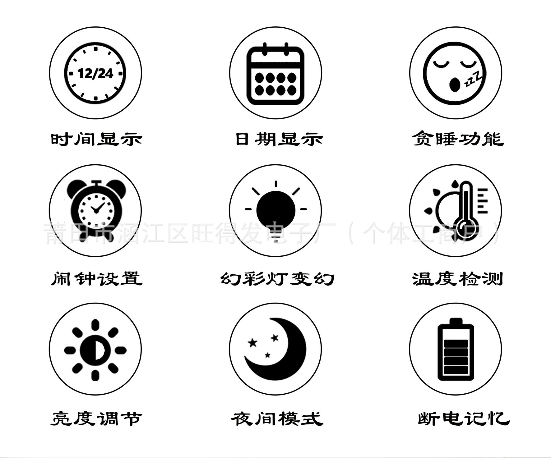 特殊功能 装饰,温度计,夜光,闹铃,24小时指示,星期显示,月份显示