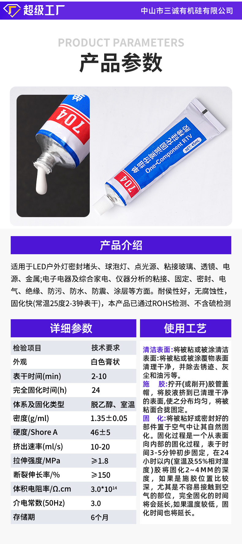 704 シリコーンゴム屋外照明器具シール防水電子部品固定絶縁高温耐性シール接着剤