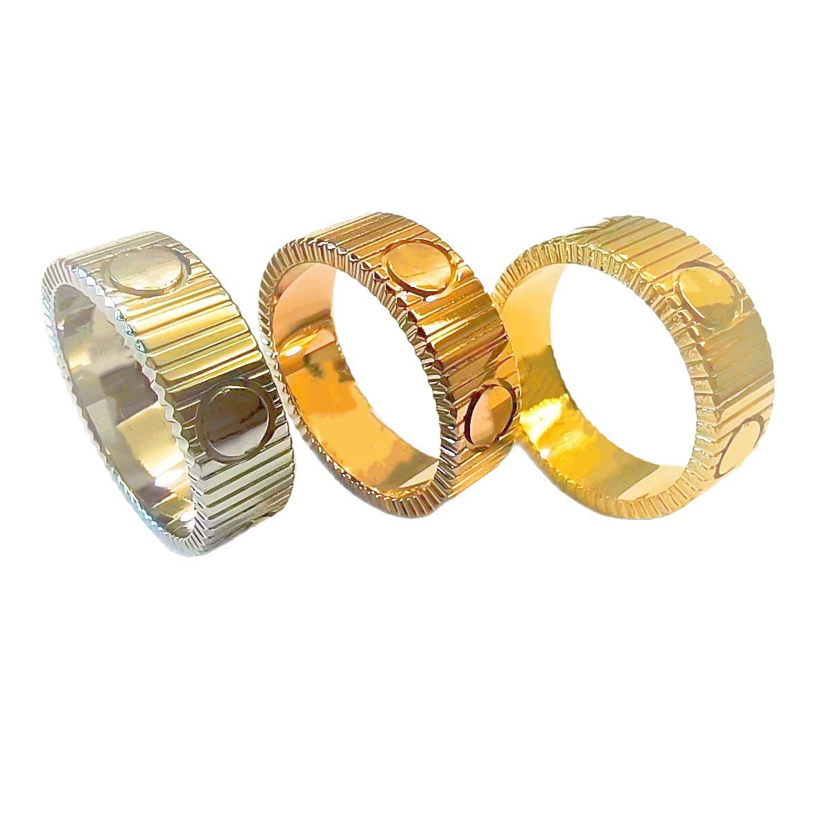 2025新款不锈钢钛钢饰品批发车花螺钉戒指齿轮纹钉纹欧美跨境锆石
