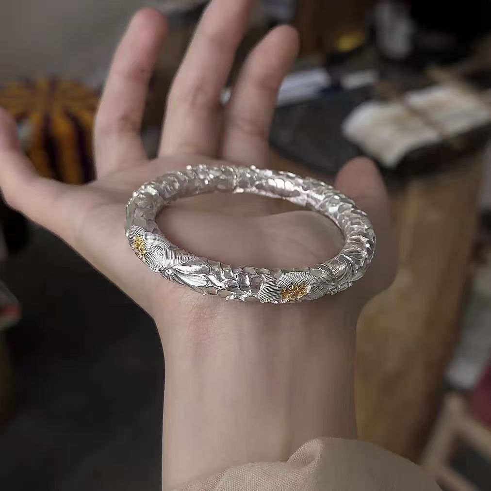 8566号足银999.9高浮雕手工錾刻牡丹手镯手工深浮雕工艺实心开口