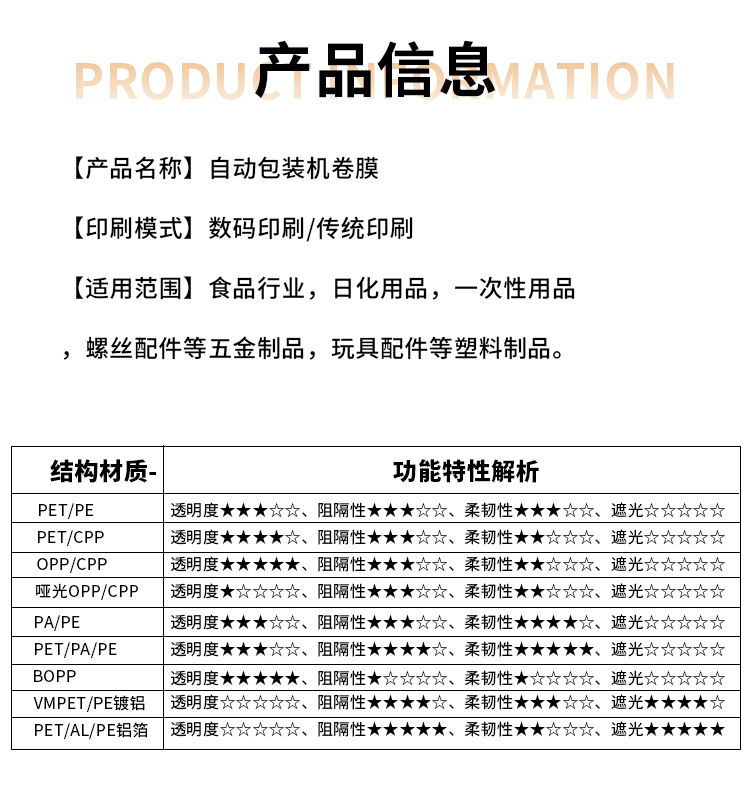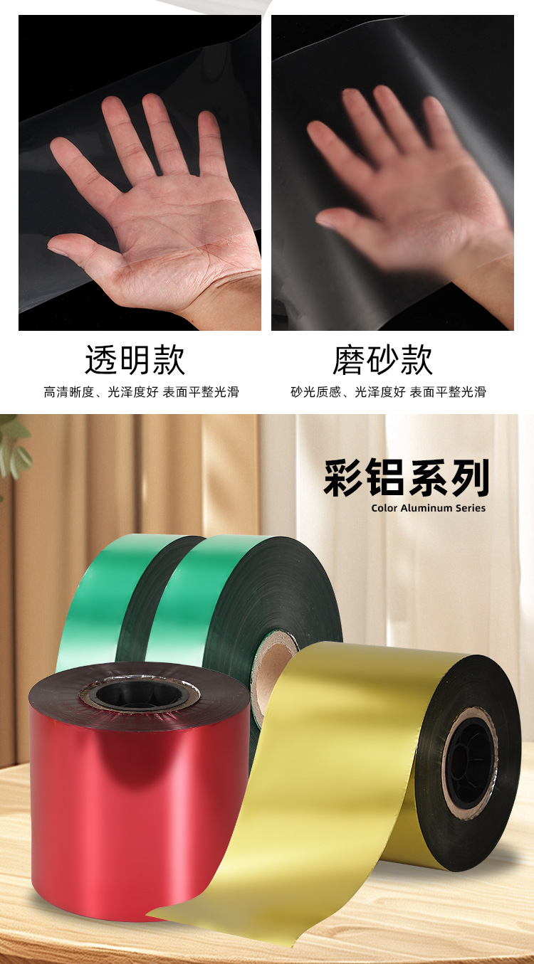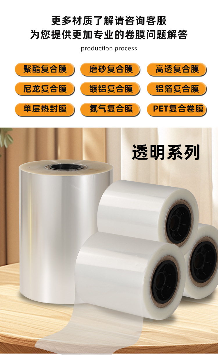 颜色 PET+PE【5丝】,PET+PE【6丝】,PET+PE【8丝】,PET+PE【10丝】,OPP+CPP【5丝】,哑光OPP+CPP【5丝】,PET+CPP【4丝】,PET+抗静电CPP【5.5丝】,PA+PE【6丝】,PA+PE【8丝】,酱汤包专用PA+PET+PE【7丝】,镀铝PET+PE【6丝】,镀铝PET+PE【8丝】,彩色镀铝PET+PE【7丝】,纯铝PET+AL+PE【8丝】,BOPP单层热封膜【3丝】