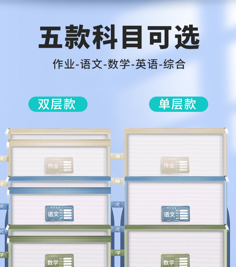 颜色 双层白网科目袋【语文】,双层白网科目袋【英语】粉,双层白网科目袋【英语】灰,双层白网科目袋【数学】,双层白网科目袋【作业】,双层白网科目袋【综合】,单层网纱科目袋【语文】,单层网纱科目袋【数学】,单层网纱科目袋【英语】粉,单层网纱科目袋【作业】,单层网纱科目袋【英语】灰