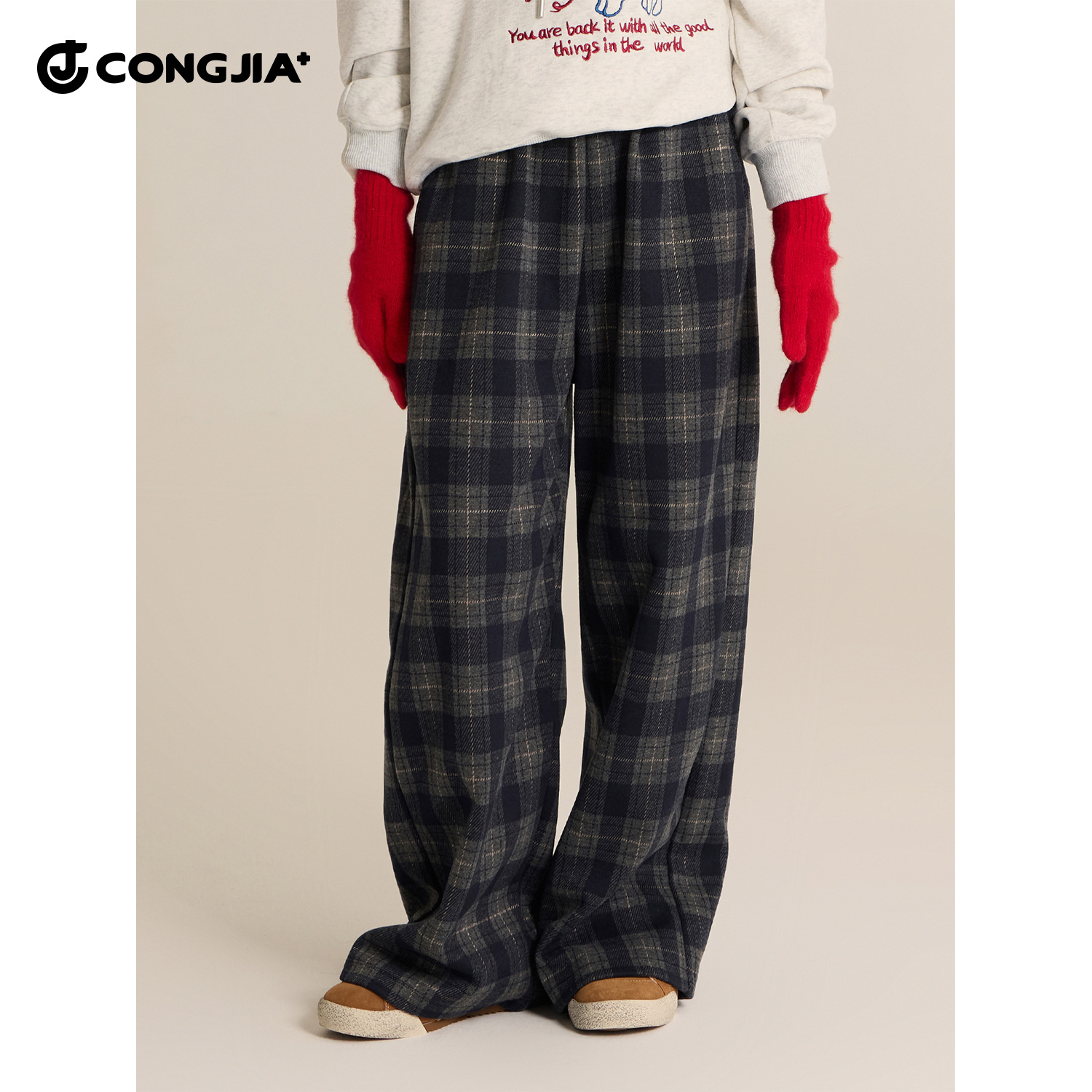 女童加绒毛呢格子裤2025秋冬新款儿童宽松休闲阔腿裤百搭直筒裤子