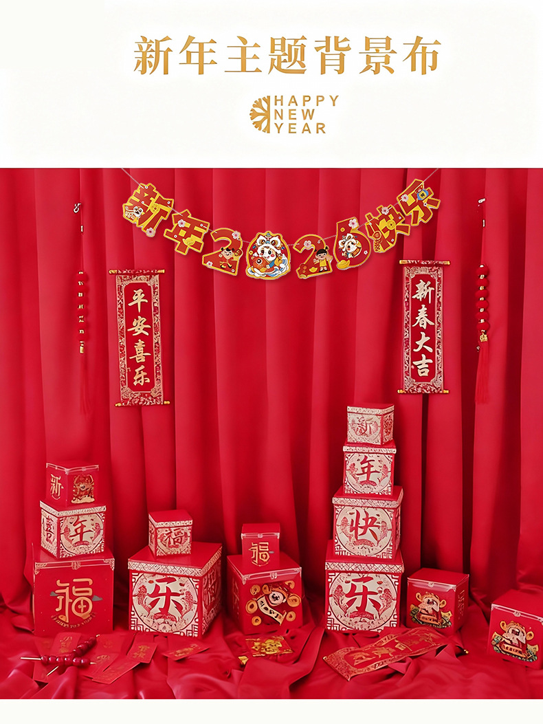 颜色 红色 2X2.4米,红色 3X2.4米,红色 4X2.4米,红色 1X1.2米,2026拉旗,恭喜发财对联,新春大吉对联,招财进宝对联一个,新年快乐对联一个,创意红包10个,仿真糖葫芦2个,新年快乐圆扇6个,灯笼一串,恭喜发财纸质礼盒4个一套,新年快乐纸质礼盒4个一套,新年拍照套装1,新年拍照套装2,新年拍照套装3