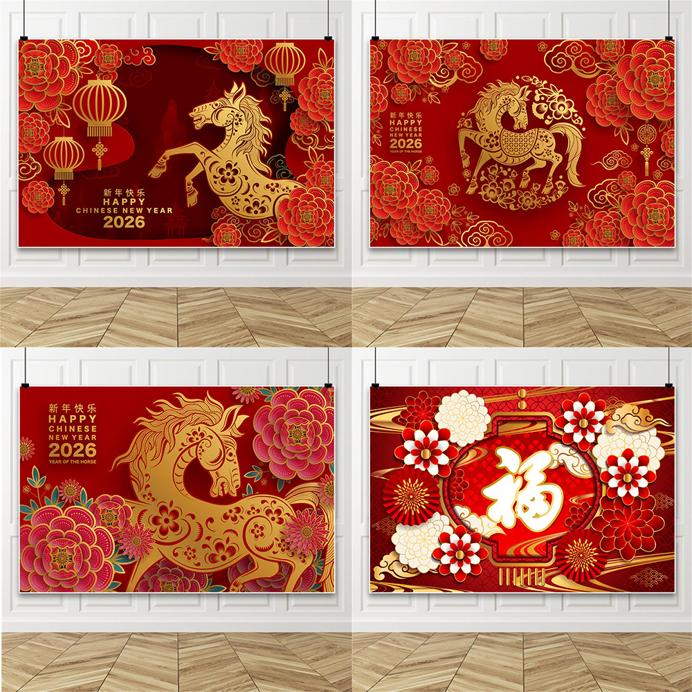 2026年红色新年新春佳节马年派对装饰外贸新款摄影背景布横幅