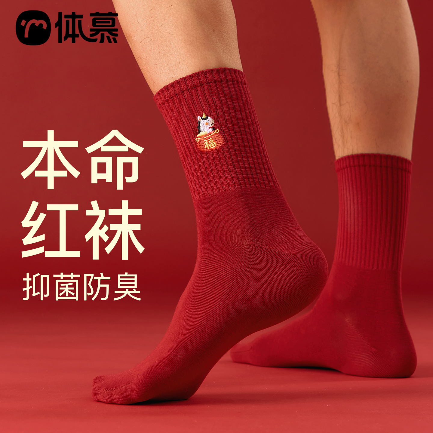 本命年属马棉刺绣男袜纯色百搭新年马年抗菌秋冬天喜庆大红色袜子