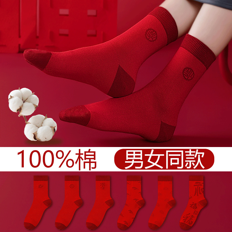 本命年红色袜子男女士纯棉中筒袜结婚情侣一对秋冬季正品棉袜批发