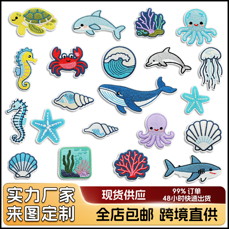 海洋生物系列刺绣布贴鲨鱼海马补丁贴衣服装饰水母背胶熨烫刺绣贴