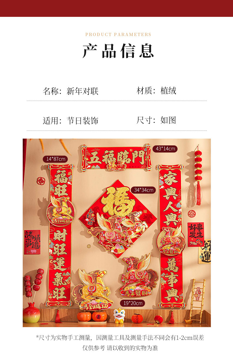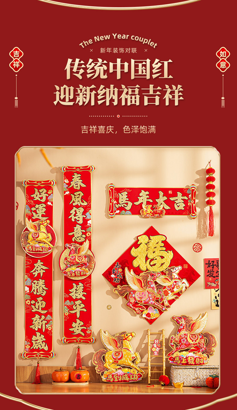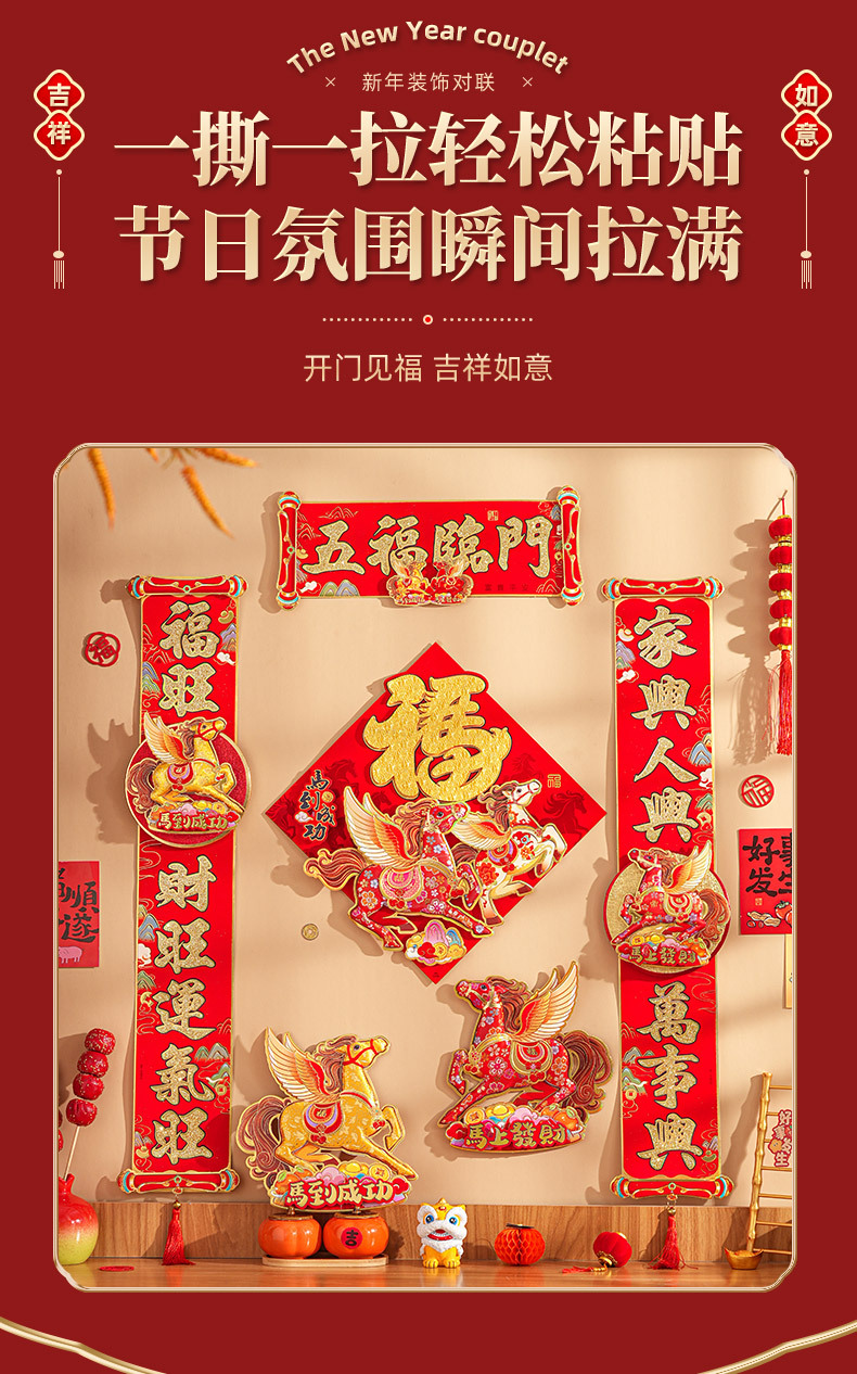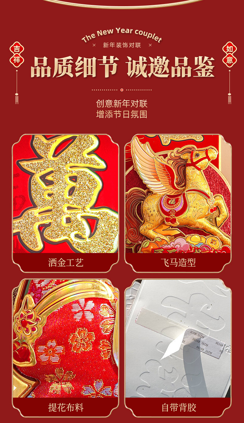 2026年馬年新作春節対句、農村工場の門用大型ベルベット生地の粘着式春節対句