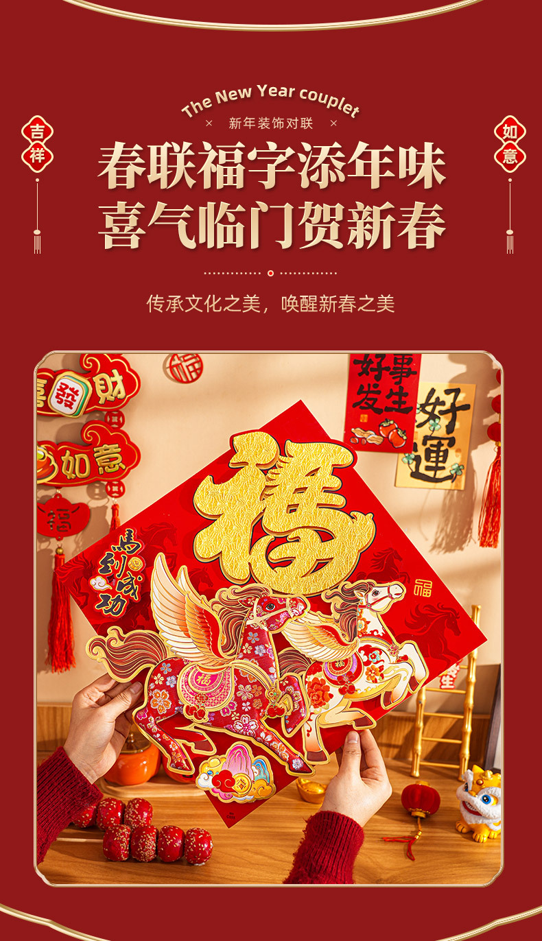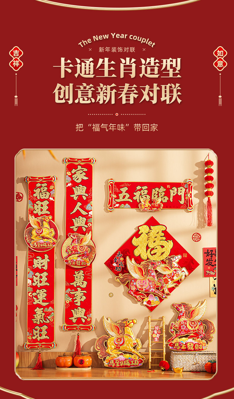 2026年馬年新作春節立体舞獅春聯、玄関ドア用福文字ドアステッカー、新年飾り