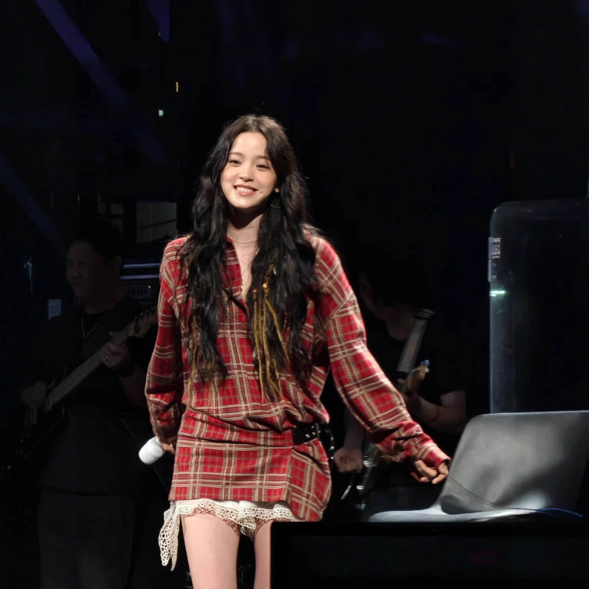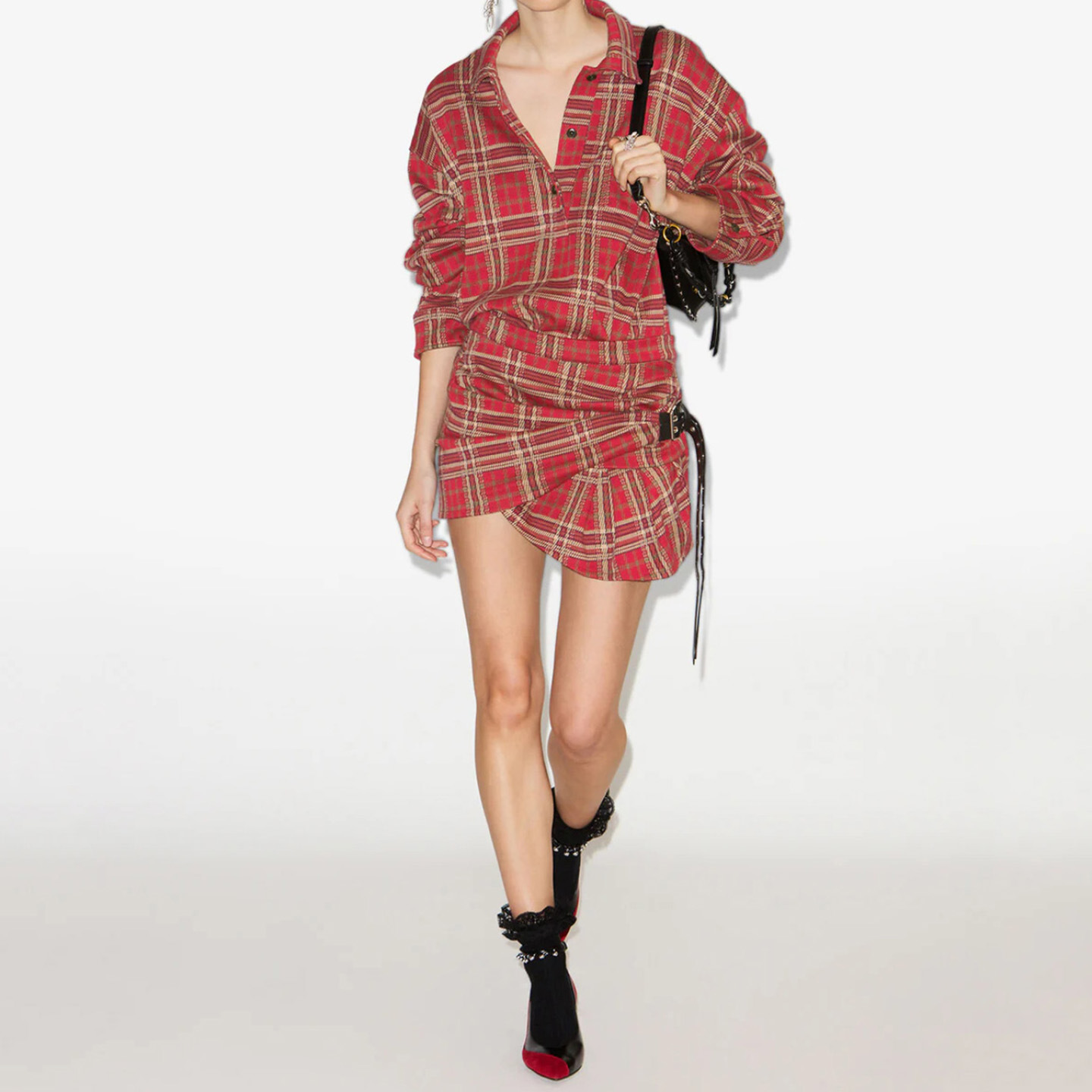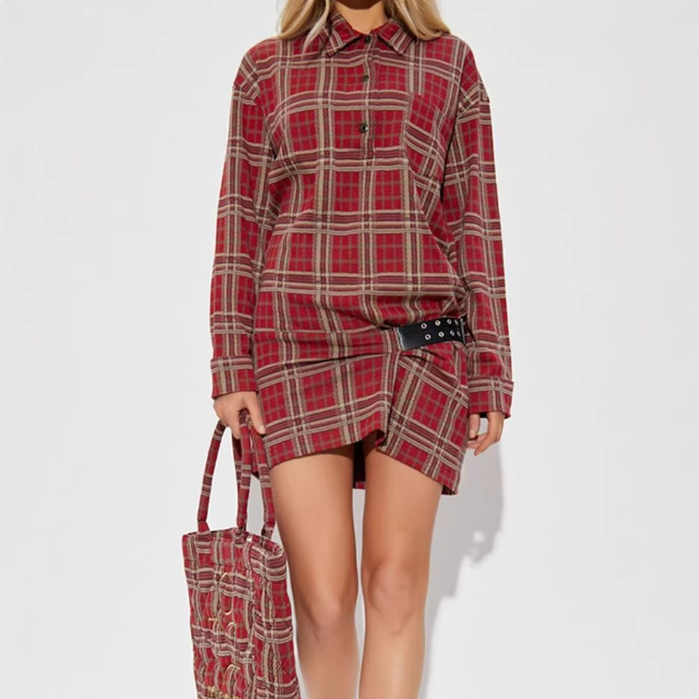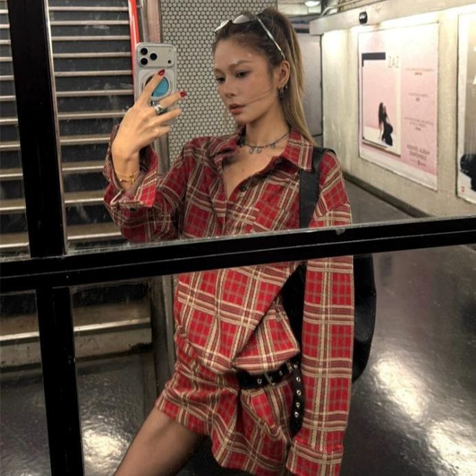 娜娜同款25秋冬复古嬉皮士不对称褶皱皮搭扣红色格纹衬衫迷你裙