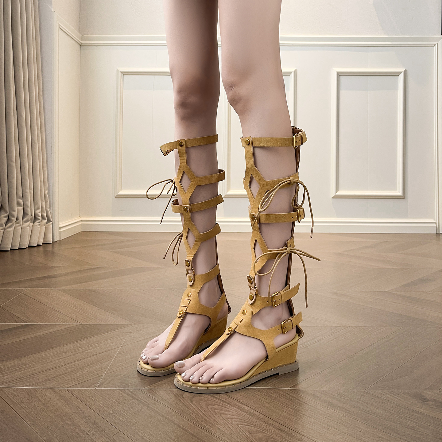 女性用インナー高さウェッジヒールサンダル 2025 新しいレトロストリート通気性ローマンミッドレングストングトゥパンツブーツ