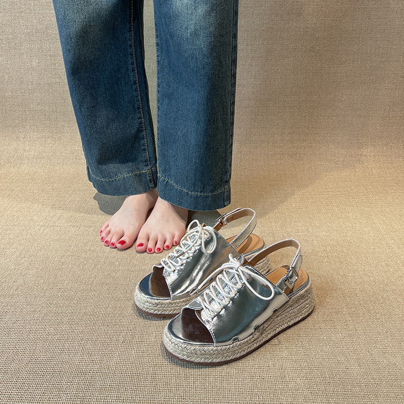 女性が外で履くための厚底ウェッジサンダル、2025年夏の妖精わらクロスストラップオープントゥ多用途ローマンシューズ