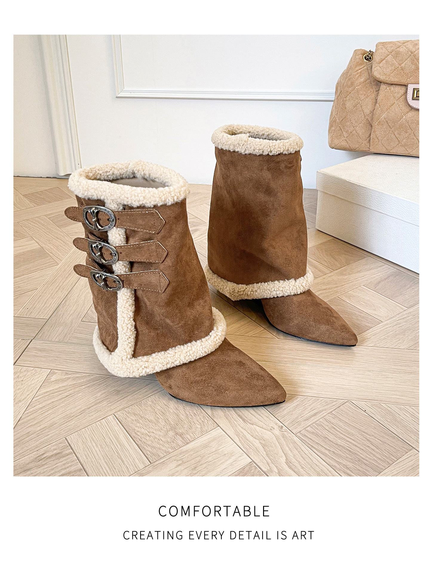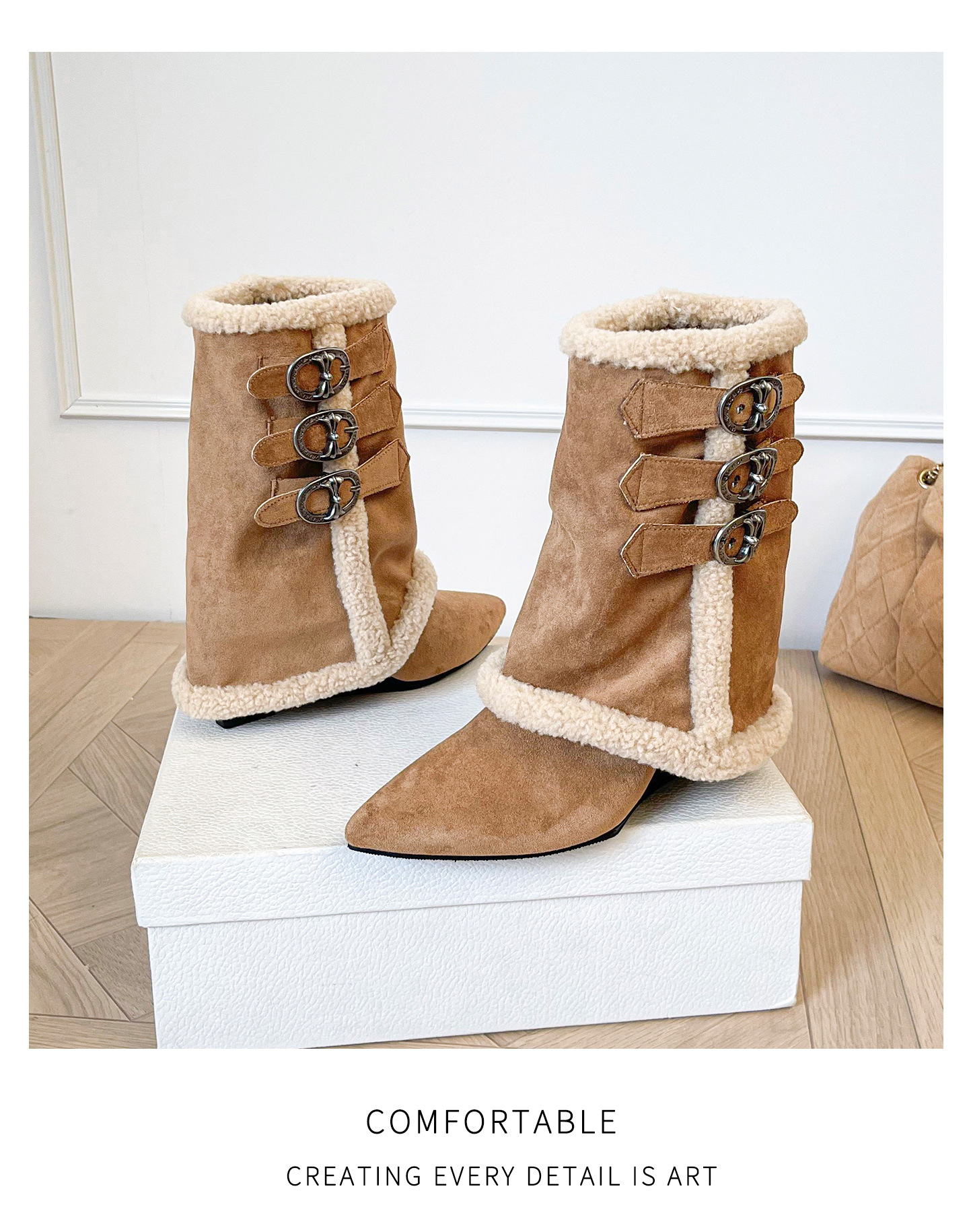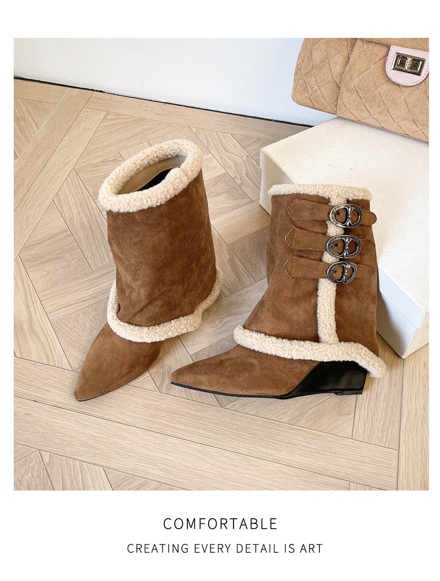 尖头羊羔毛高跟马丁靴女2025年秋冬辣妹内增高坡跟加绒保暖雪地靴