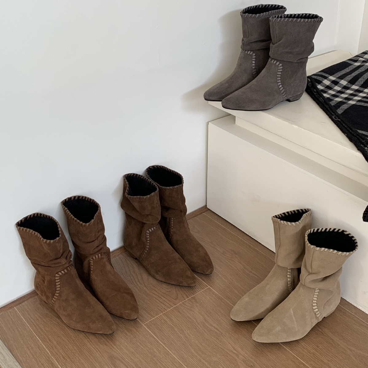2025秋冬新款圆头真皮磨砂低筒编织绒面瘦瘦堆堆马丁女短靴