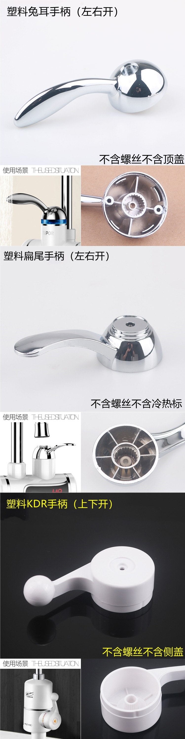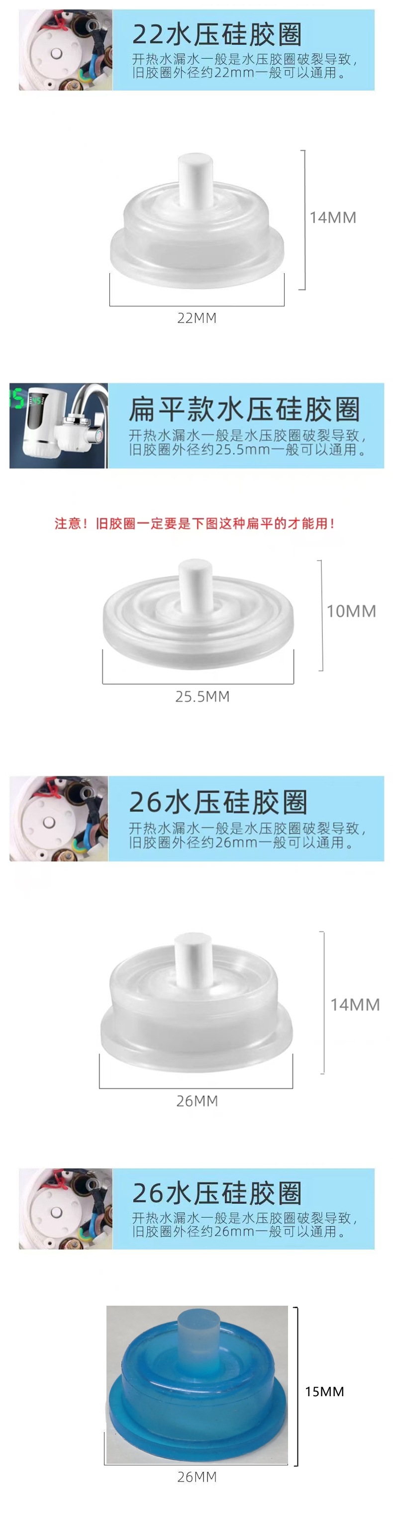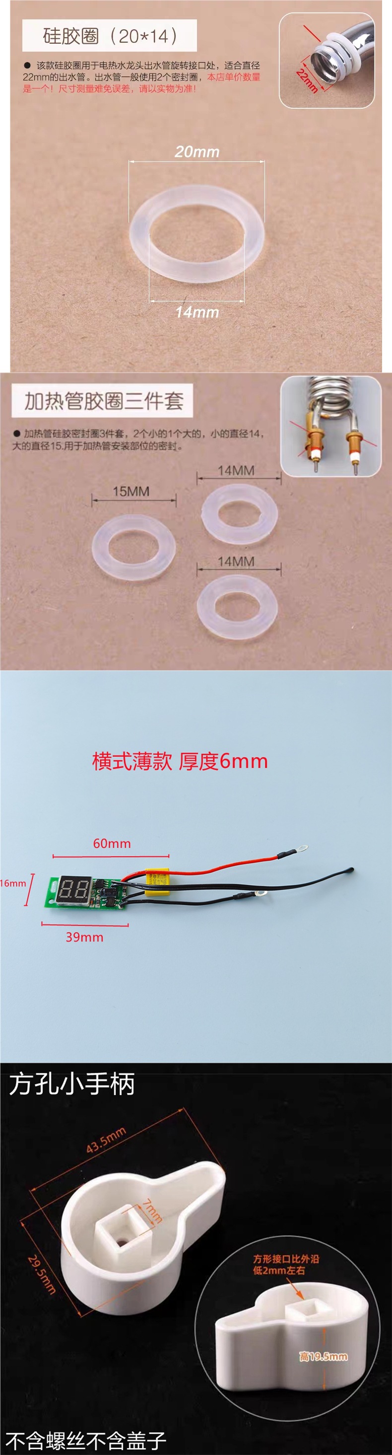 规格 17水压硅胶圈,22水压硅胶圈,扁平款水压硅胶圈,26水压硅胶圈,26硅胶一体,13*7*8.5胶圈,22弯管密封圈,加热管胶圈三件套,24A款银触片,下进水穿线板,下进水四分螺帽,下进水橡胶垫,侧进水黄三件套,横款泄压塞一个,横款发热管06型,数显横款粗头保险丝,数显竖款细头保险丝,18弯管螺帽(细螺纹),22弯管螺帽(细螺纹),塑料扁尾手柄(左右开),塑料一字手柄(上下开),塑料兔耳手柄(左右开),塑料KDR手柄(上下开),方孔小手柄,64外径侧盖,58外径垫,58外径侧盖,53外径垫,10A漏电保护插头一只,阀芯一只,横式薄款数显板,竖款厚款数显板,竖款泄压塞一个,22塑料万向头加压出水嘴,22塑料圆头加压出水嘴,22不锈钢防溅出水嘴,22不锈钢大圆头加压出水嘴