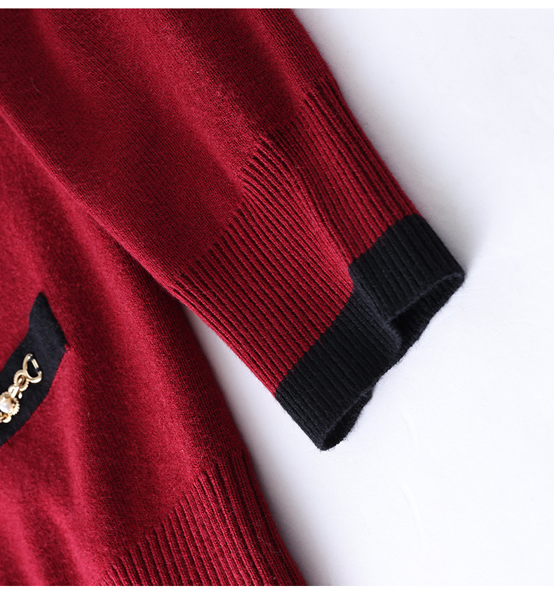 秋冬新款2025圆领长袖羊毛呢针织衫女重工镶钻过年圣诞暗红色上衣