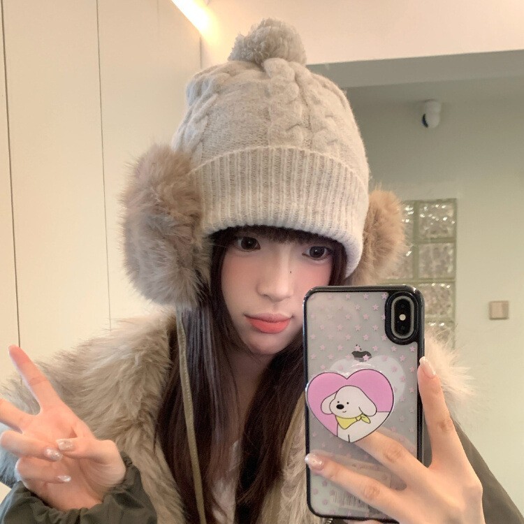 秋冬双耳毛绒耳罩不加绒保暖护耳雷锋帽绑带女户外可爱百搭针织帽