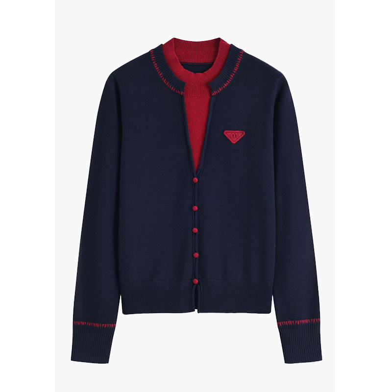 假两件圆领长袖拼色针织衫女2025秋冬新款小个子气质百搭羊毛上衣