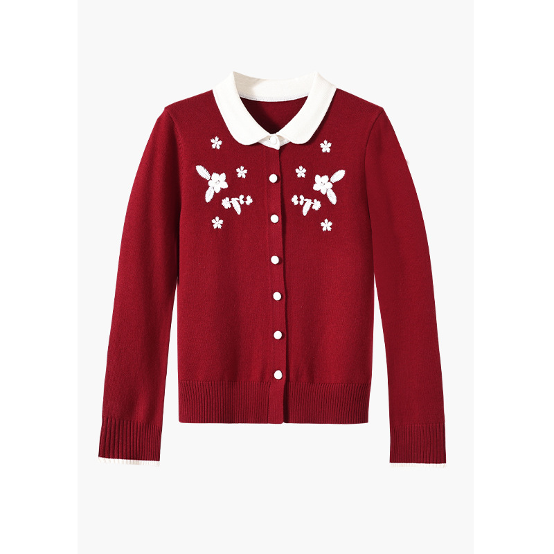 新年の赤いニットカーディガン レディース 2025年秋新作 フレンチスタイル ショート丈トップス 気質アップ 細見え セーターコート