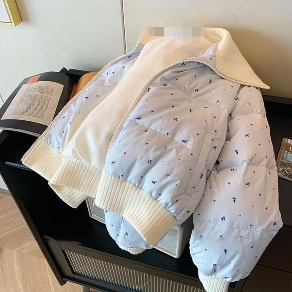 甜美碎花翻领棉服外套女冬季蓝色设计感小众拼接拉链棉衣棉袄ins