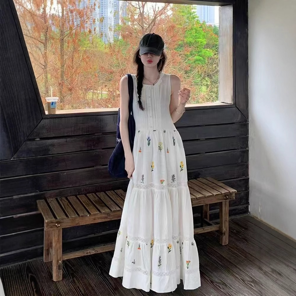 夏の新しいフレンチカジュアルレトロ花柄レースステッチロングホリデースタイルドレスレディースデザインベストドレス